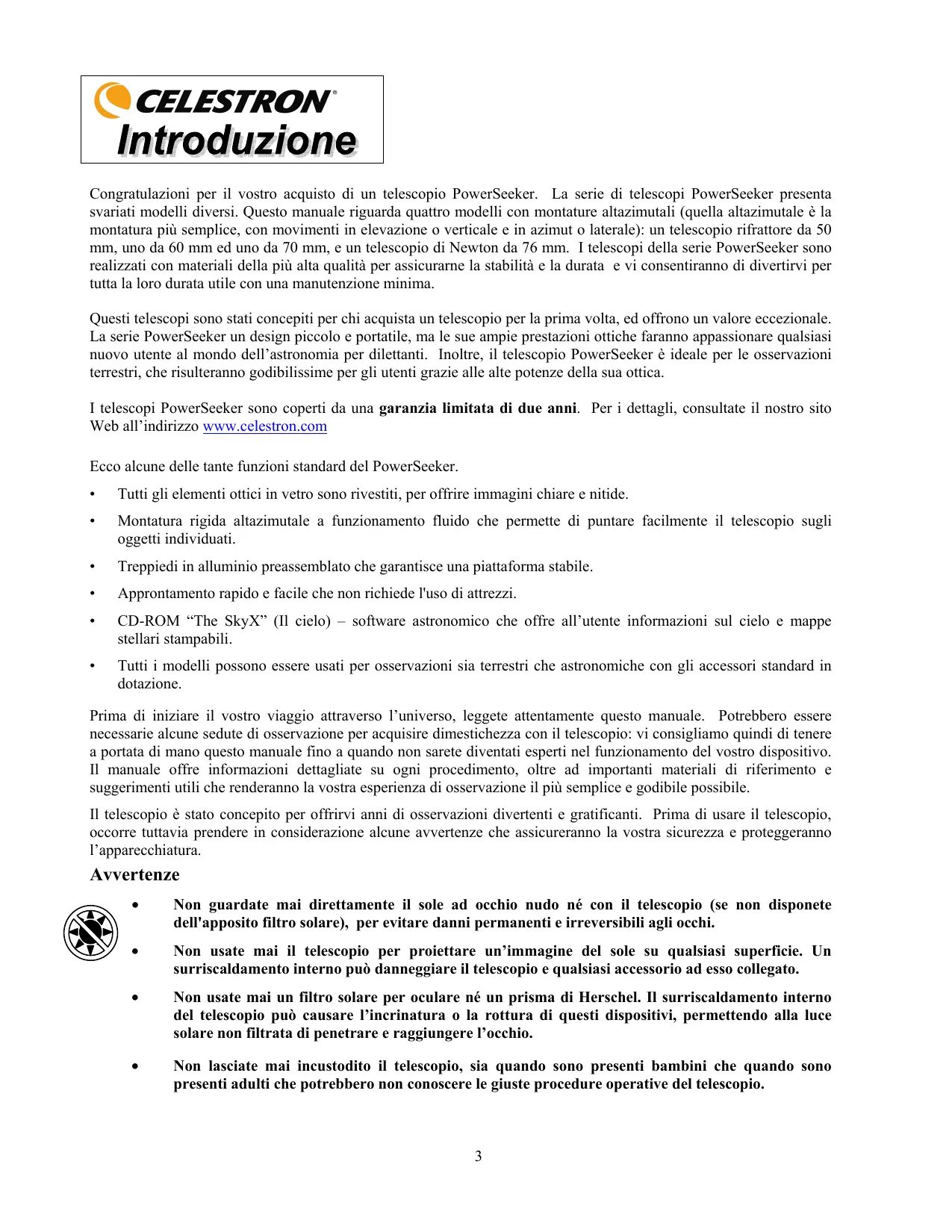 Congratulazioni per il vostro acquisto di un telescopio PowerSeeker. La serie di telescopi PowerSeeker presenta svariati modelli diversi. Questo manuale riguarda quattro modelli con montature altazimutali (quella altazimutale è la montatura più semplice, con movimenti in elevazione o verticale e in azimut o laterale): un telescopio rifrattore da 50 mm, uno da 60 mm ed uno da 70 mm, e un telescopio di Newton da 76 mm. I telescopi della serie PowerSeeker sono realizzati con materiali della più alta qualità per assicurarne la stabilità e la durata e vi consentiranno di divertirvi per tutta la loro durata utile con una manutenzione minima. Questi telescopi sono stati concepiti per chi acquista un telescopio per la prima volta, ed offrono un valore eccezionale. La serie PowerSeeker un design piccolo e portatile, ma le sue ampie prestazioni ottiche faranno appassionare qualsiasi nuovo utente al mondo dell’astronomia per dilettanti. Inoltre, il telescopio PowerSeeker è ideale per le osservazioni terrestri, che risulteranno godibilissime per gli utenti grazie alle alte potenze della sua ottica. I telescopi PowerSeeker sono coperti da una garanzia limitata di due anni. Per i dettagli, consultate il nostro sito Web all’indirizzo www.celestron.com Ecco alcune delle tante funzioni standard del PowerSeeker.