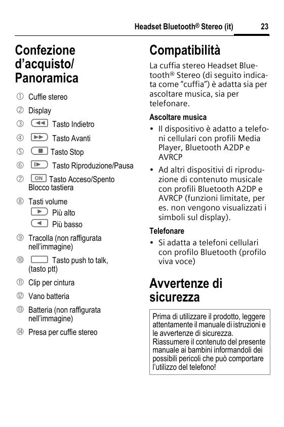 Headset Bluetooth® Stereo (it) 23 Confezione d’acquisto/ Panoramica Cuffie stereo @ Display CI Tasto Indietro Œ#) Tasto Avanti CM] Tasto Stop Ü») Tasto Riproduzione/Pausa o) Tasto Acceso/Spento Blocco tastiera ® Tasti volume OC) più alto C£] Più basso © Tracolla (non raffigurata nel'immagine) ® C2] Tasto push to talk, (tasto pt) ® Clip per cintura ® Vano batteria ® Batteria (non raffgurata nel'immagine) @ Presa per cu stereo Compatibilità La cuffia stereo Headset Blue- tooth® Stereo (di seguito indica- ta come "cuffia”) à adatta sia per ascoltare musica, sia per telefonare. Ascoltare musica Il dispositivo à adatto a telefo- ni cellulari con profili Media Player, Bluetooth A2DP e AVRCP Ad altri dispositivi di riprodu- zione di contenuto musicale con profili Bluetooth A2DP e AVRCP (funzioni limitate, per es. non vengono visualizzati i simboli sul display). Telefonare + Si adatta a telefoni cellulari con profil Bluetooth (profilo viva voce) Avvertenze di sicurezza Prima di utlizzare il prodotto, leggere attentamente il manuale diisiruzioni e le awvertenze di sicurezza. Riassumere il contenuto del presente manuale ai bambini informandoli dei possibil pericoli che puè comportare l'utlizzo del telefono!