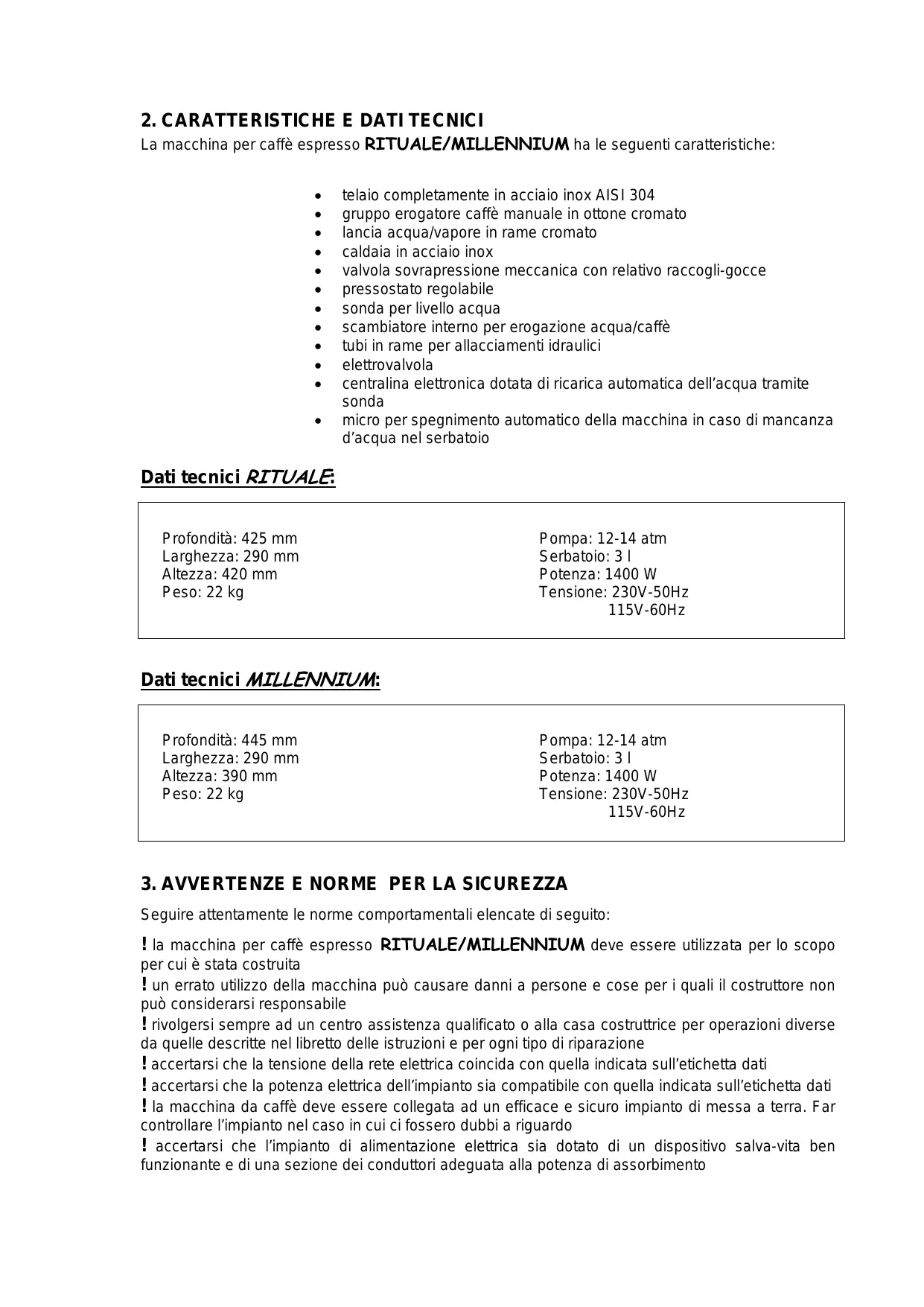 La macchina per caffè espresso RITUALE/MILLENNIUM ha le seguenti caratteristiche: telaio completamente in acciaio inox AISI 304 gruppo erogatore caffè manuale in ottone cromato lancia acqua/vapore in rame cromato caldaia in acciaio inox valvola sovrapressione meccanica con relativo raccogli-gocce pressostato regolabile sonda per livello acqua scambiatore interno per erogazione acqua/caffè tubi in rame per allacciamenti idraulici elettrovalvola centralina elettronica dotata di ricarica automatica dell'acqua tramite sonda + micro per spegnimento automatico della macchina in caso di mancanza d'acqua nel serbatoio Dati tecnici RTTUALE; Profondità: 425 mm Pompa: 12-14 atm Larghezza: 290 mm Serbatoio: 3 | Altezza: 420 mm Potenza: 1400 W Peso: 22 kg Tensione: 230V-50Hz 115V-60Hz Dati tecnici MILLENNIUM: Profondità: 445 mm Pompa: 12-14 atm Larghezza: 290 mm Serbatoio: 3 | Altezza: 390 mm Potenza: 1400 W Peso: 22 kg Tensione: 230V-50Hz 115V-60Hz
