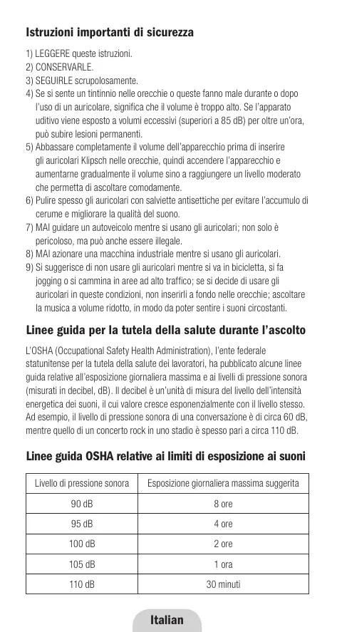 L'OSHA (Occupational Safety Health Administration), lente federale Statunitense per la tutela della salute dei lavorator, ha pubblcato lcune inee guida relative al'esposizione giomaliera massima e ai ill di pressione sonora {misuratiin decibel, dB). 1 decibel à un'unità di misura del Ivelo delintensià energetica dei suoni, il cui valor cresce esponenziaimente con il ivelostesso. AAd esempio, il ivll di pressione sonora di una conversazione à di crca 60 dB, mentre quel di un concerto rock in uno stacio à spesso pari a circa 110 68.