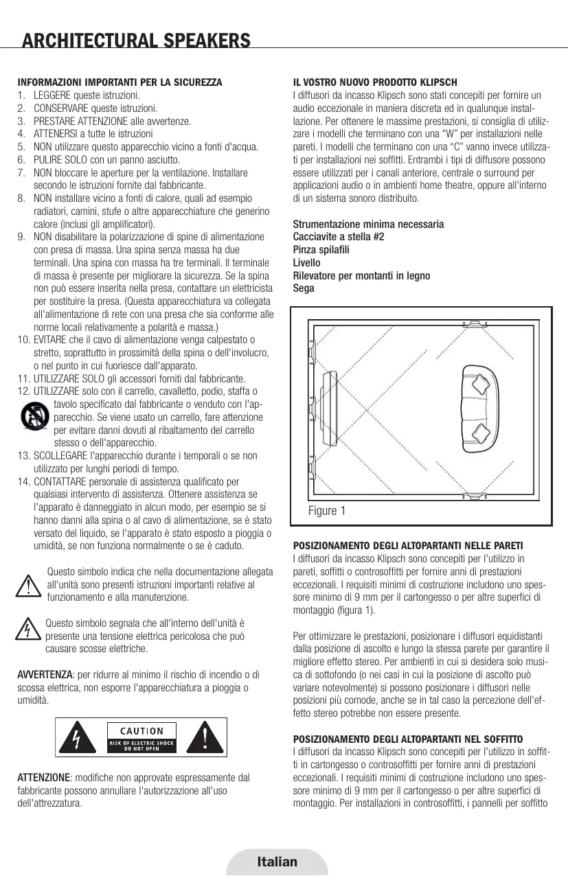 I diffusori da incasso Klipsch sono concepti per l'utilizzo in pareti, soffitti o controsoffitti per fornire anni di prestazioni eccezionali. I requisiti minimi di costruzione includono uno spessore minimo di 9 mm per il cartongesso o per altre superfici di montaggio (figura 1).