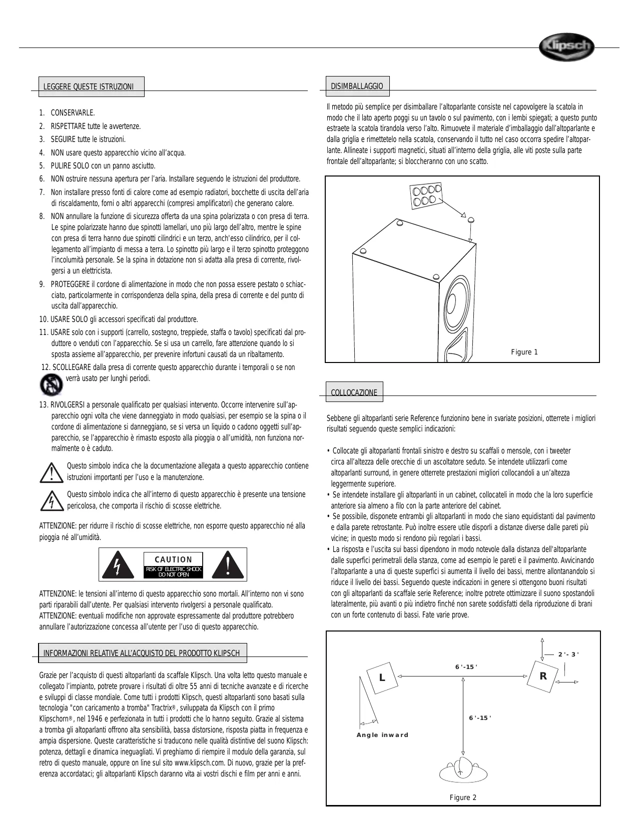 Grazie per l'acquisto di quosti altoparlanti da scaffale Klipsch. Una volta letto quello manuale e collegato l'impianto, potrete provare i risultati di altre 55 anni di tecniche avanzate e di ricerche e sviluppi di classe mondiale. Come tutti i prodotti Klipsch, quosti altoparlanti sono basati sulla technologia "con caricamento a tromba" Tractrix®, sviluppata da Klipsch con il primo Klipschorn®, nel 1946 e perfezionata in tutti i prodotti che lo hanno seguito. Grazie alsystema a tromba gli altoparlanti offrono alta sensibilità, Bassa distorsione, risposta piatta in frequenza e ampia dispersione. Queste caratteristiche si traducono nelle qualità distinctive del suono Klipsch: potenza, dettagli e dinamiche ineguagliati. Vi preghiamo di riempire il modulo della garanzia, sul retro di quello manuale, oppure on line sul sito www.klipsch.com. Di nuovo, grazie per la preferenza accordataci; gli altoparlanti Klipsch daranno vita ai vostri dischi e film per anni e anni.
