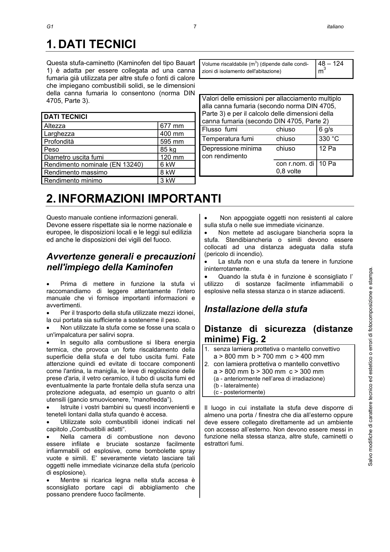 Non appoggiate oggetti non resistenti al calore sulla stufa o nelle sue immediate vicinanze. Non mettete ad asciugare biancheria sopra la stufa. Stendibiancheria o simili devono essere collocati ad una distanza adeguata dalla stufa (pericolo di incendio). La stufa non e una stufa da tenere in funzione ininterrotamente. Quando la stufa è in funzione è sconsigliato l’ utilizzo di sostanze facilmente infiammabili o esplosive nella stessa stanza o in stanze adiacenti. Installazione della stufa Distanze di sicurezza (distanze minime) Fig. 2