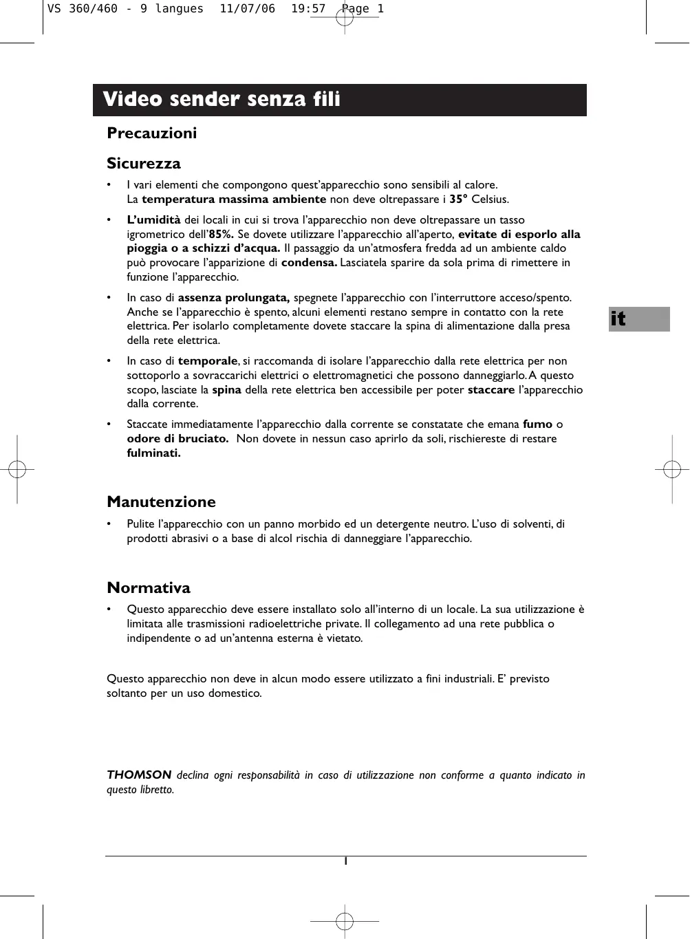 THOMSON declina ogni responsabilità in caso di utilizzazione non conforme a quanto indicato in questo libretto.