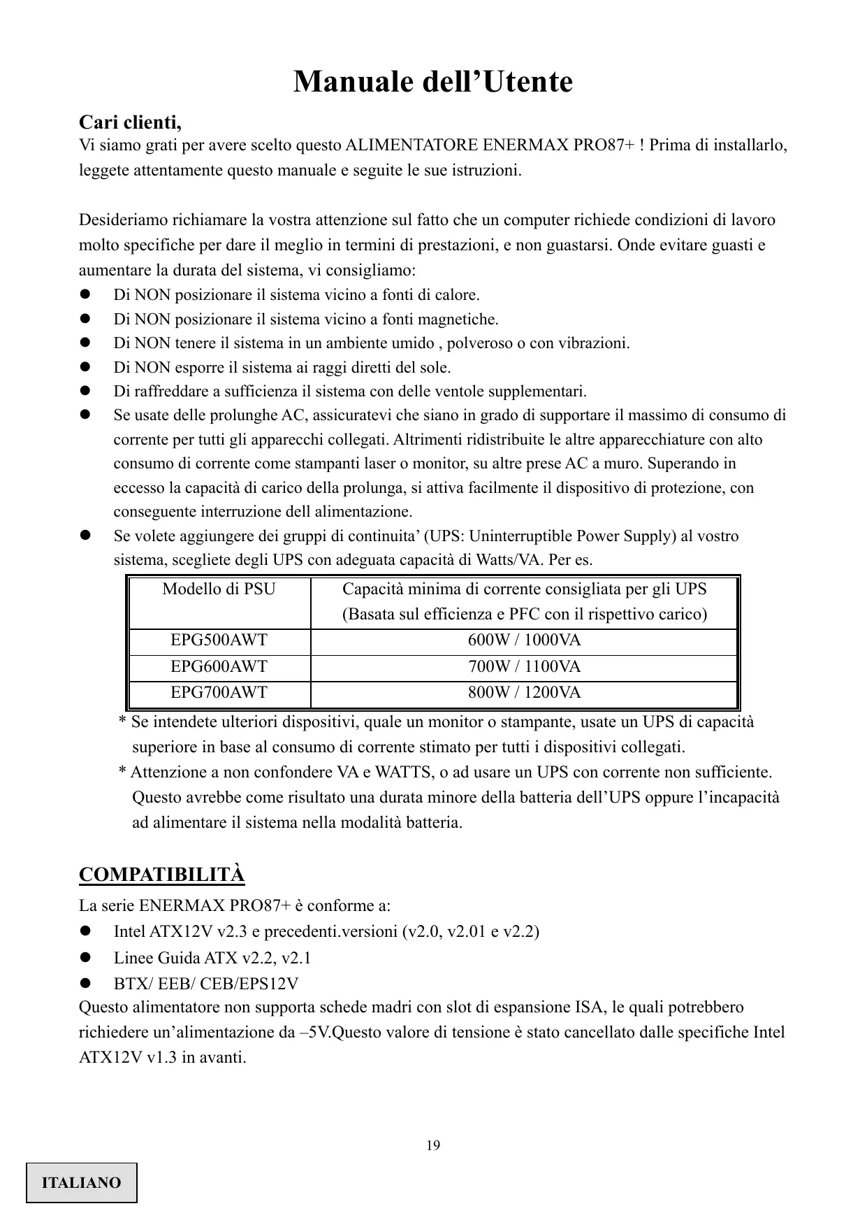 Vi siamo grati per averere scelto quello ALIMENTATORE ENERMAX PRO87+! Prima di installarlo, leggete attendamente quello manuale e seguite le sue istruzioni.