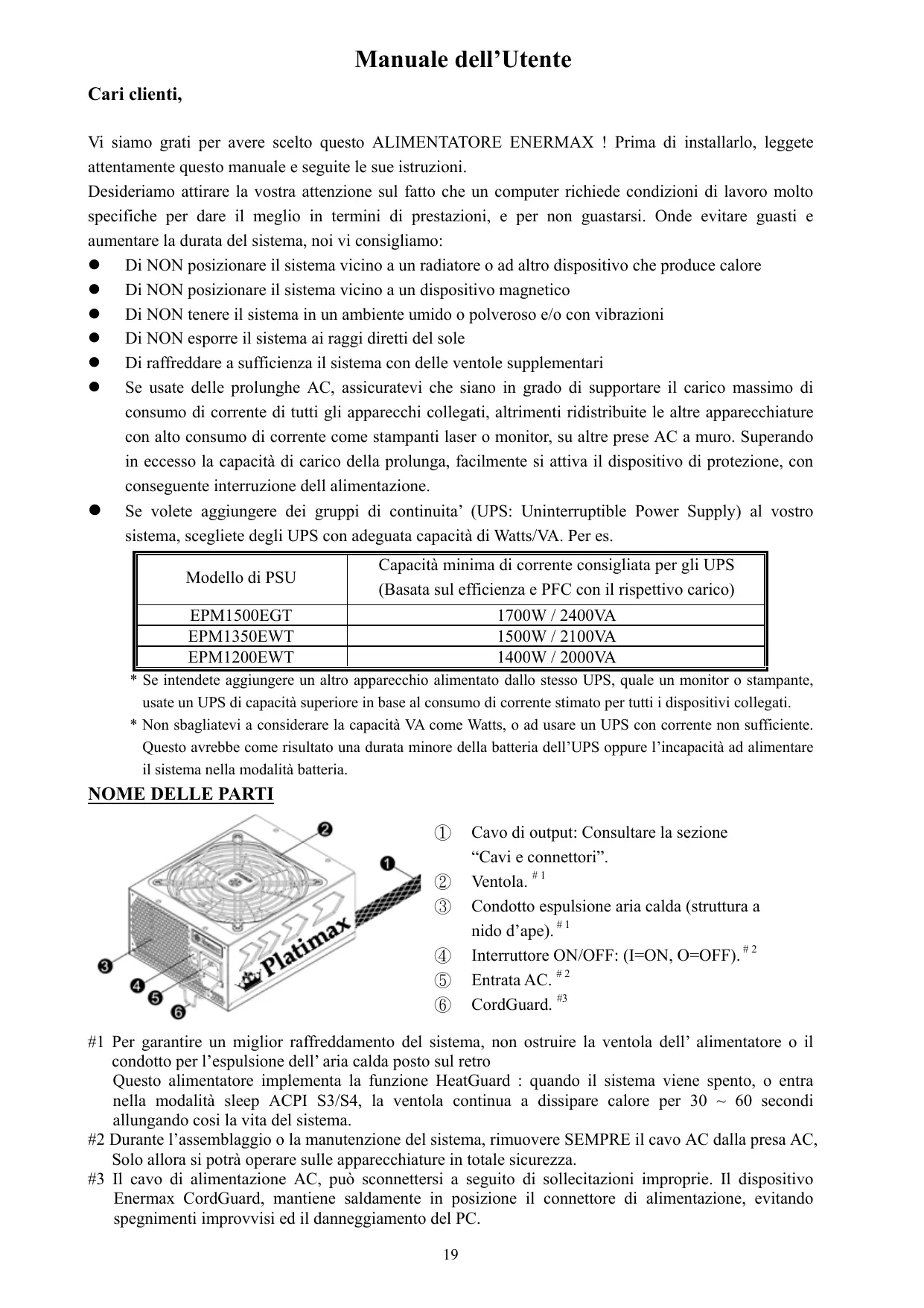 #1 Per garantire un miglior raffreddamento del sistema, non ostruire la ventola dell’ alimentatore o il condotto per l’espulsione dell’ aria calda posto sul retro Questo alimentatore implementa la funzione HeatGuard : quando il sistema viene spento, o entra nella modalità sleep ACPI S3/S4, la ventola continua a dissipare calore per 30 ~ 60 secondi allungando cosi la vita del sistema. #2 Durante l’assemblaggio o la manutenzione del sistema, rimuovere SEMPRE il cavo AC dalla presa AC, Solo allora si potrà operare sulle apparecchiature in totale sicurezza. #3 Il cavo di alimentazione AC, può sconnettersi a seguito di sollecitazioni improprie. Il dispositivo Enermax CordGuard, mantiene saldamente in posizione il connettore di alimentazione, evitando spegnimenti improvvisi ed il danneggiamento del PC. 19