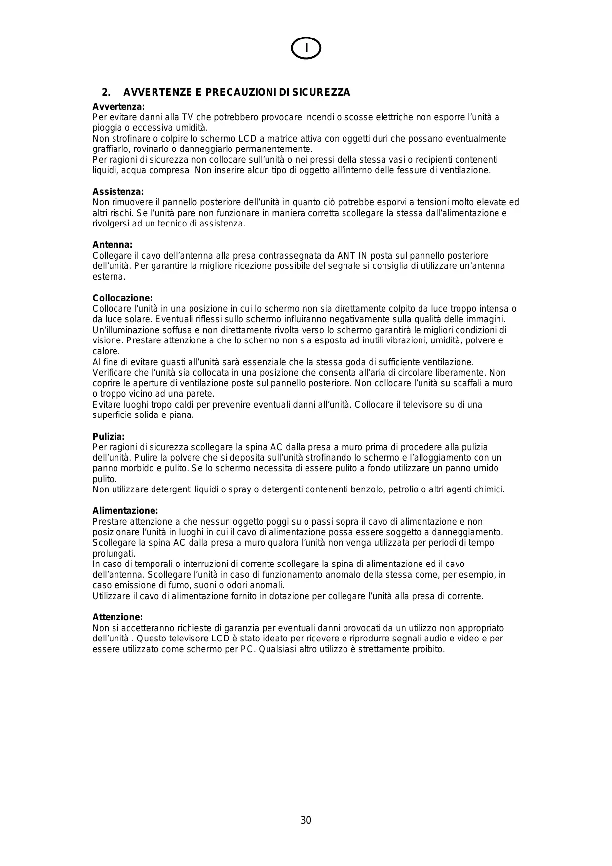 Avvertenza: Per evitare danni alla TV che potrebbero provocare incendi o scosse elettriche non esporre l’unità a pioggia o eccessiva umidità. Non strofinare o colpire lo schermo LCD a matrice attiva con oggetti duri che possano eventualmente graffiarlo, rovinarlo o danneggiarlo permanentemente. Per ragioni di sicurezza non collocare sull’unità o nei pressi della stessa vasi o recipienti contenenti liquidi, acqua compresa. Non inserire alcun tipo di oggetto all’interno delle fessure di ventilazione. Assistenza: Non rimuovere il pannello posteriore dell’unità in quanto ciò potrebbe esporvi a tensioni molto elevate ed altri rischi. Se l’unità pare non funzionare in maniera corretta scollegare la stessa dall’alimentazione e rivolgersi ad un tecnico di assistenza. Antenna: Collegare il cavo dell’antenna alla presa contrassegnata da ANT IN posta sul pannello posteriore dell’unità. Per garantire la migliore ricezione possibile del segnale si consiglia di utilizzare un’antenna esterna. Collocazione: Collocare l’unità in una posizione in cui lo schermo non sia direttamente colpito da luce troppo intensa o da luce solare. Eventuali riflessi sullo schermo influiranno negativamente sulla qualità delle immagini. Un’illuminazione soffusa e non direttamente rivolta verso lo schermo garantirà le migliori condizioni di visione. Prestare attenzione a che lo schermo non sia esposto ad inutili vibrazioni, umidità, polvere e calore. Al fine di evitare guasti all’unità sarà essenziale che la stessa goda di sufficiente ventilazione. Verificare che l’unità sia collocata in una posizione che consenta all’aria di circolare liberamente. Non coprire le aperture di ventilazione poste sul pannello posteriore. Non collocare l’unità su scaffali a muro o troppo vicino ad una parete. Evitare luoghi tropo caldi per prevenire eventuali danni all’unità. Collocare il televisore su di una superficie solida e piana. Pulizia: Per ragioni di sicurezza scollegare la spina AC dalla presa a muro prima di procedere alla pulizia dell’unità. Pulire la polvere che si deposita sull’unità strofinando lo schermo e l’alloggiamento con un panno morbido e pulito. Se lo schermo necessita di essere pulito a fondo utilizzare un panno umido pulito. Non utilizzare detergenti liquidi o spray o detergenti contenenti benzolo, petrolio o altri agenti chimici. Alimentazione: Prestare attenzione a che nessun oggetto poggi su o passi sopra il cavo di alimentazione e non posizionare l’unità in luoghi in cui il cavo di alimentazione possa essere soggetto a danneggiamento. Scollegare la spina AC dalla presa a muro qualora l’unità non venga utilizzata per periodi di tempo prolungati. In caso di temporali o interruzioni di corrente scollegare la spina di alimentazione ed il cavo dell’antenna. Scollegare l’unità in caso di funzionamento anomalo della stessa come, per esempio, in caso emissione di fumo, suoni o odori anomali. Utilizzare il cavo di alimentazione fornito in dotazione per collegare l’unità alla presa di corrente. Attenzione: Non si accetteranno richieste di garanzia per eventuali danni provocati da un utilizzo non appropriato dell’unità . Questo televisore LCD è stato ideato per ricevere e riprodurre segnali audio e video e per essere utilizzato come schermo per PC. Qualsiasi altro utilizzo è strettamente proibito.
