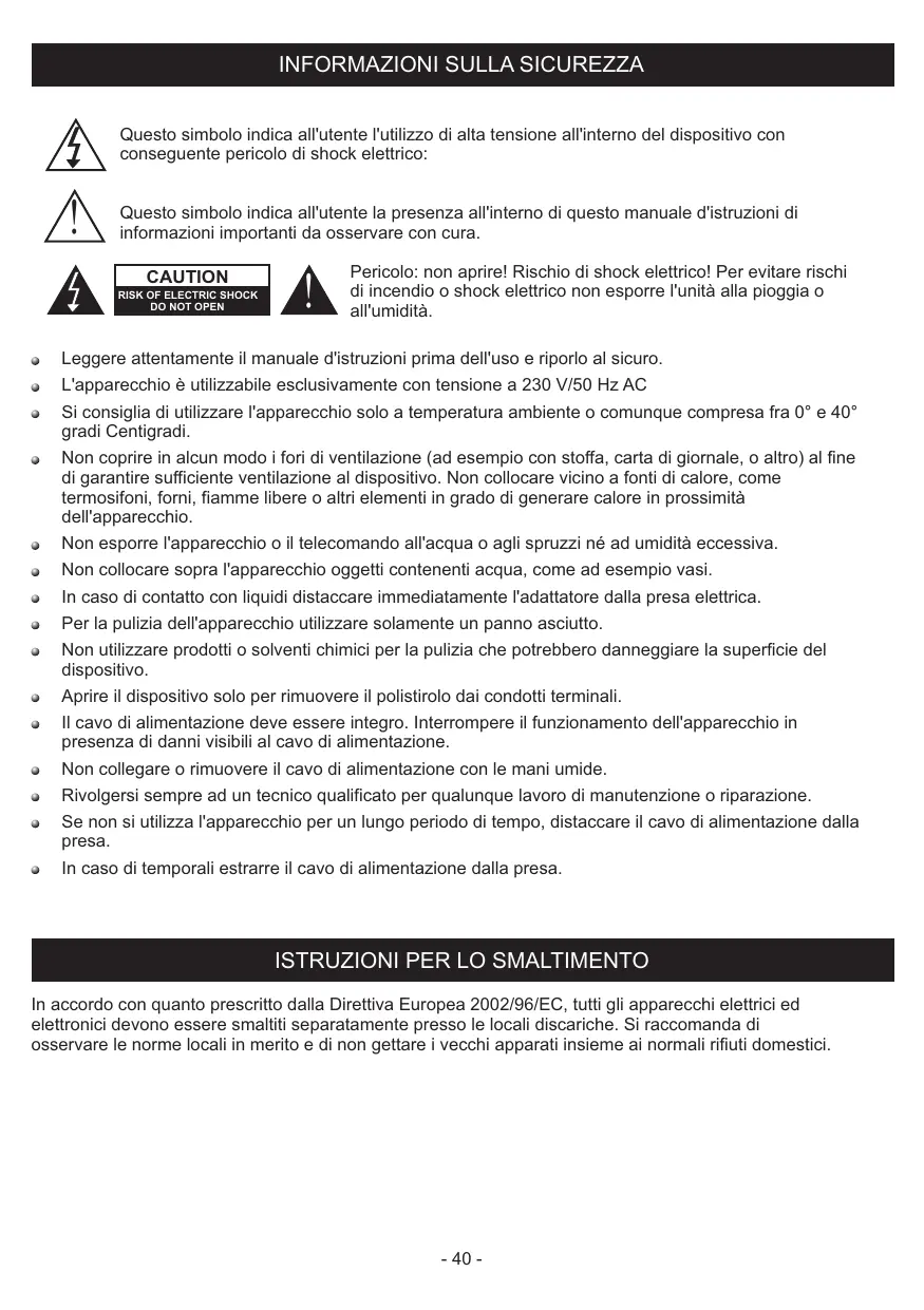 Pericolo: non aprire! Rischio di shock elettrico! Per evitare rischi di incendio o shock elettrico non esporre l'unità alla pioggia o all'umidità. Leggere attentamente il manuale d'istruzioni prima dell'uso e riporlo al sicuro. L'apparecchio è utilizzabile esclusivamente con tensione a 230 V/50 Hz AC Si consiglia di utilizzare l'apparecchio solo a temperatura ambiente o comunque compresa fra 0° e 40° gradi Centigradi.