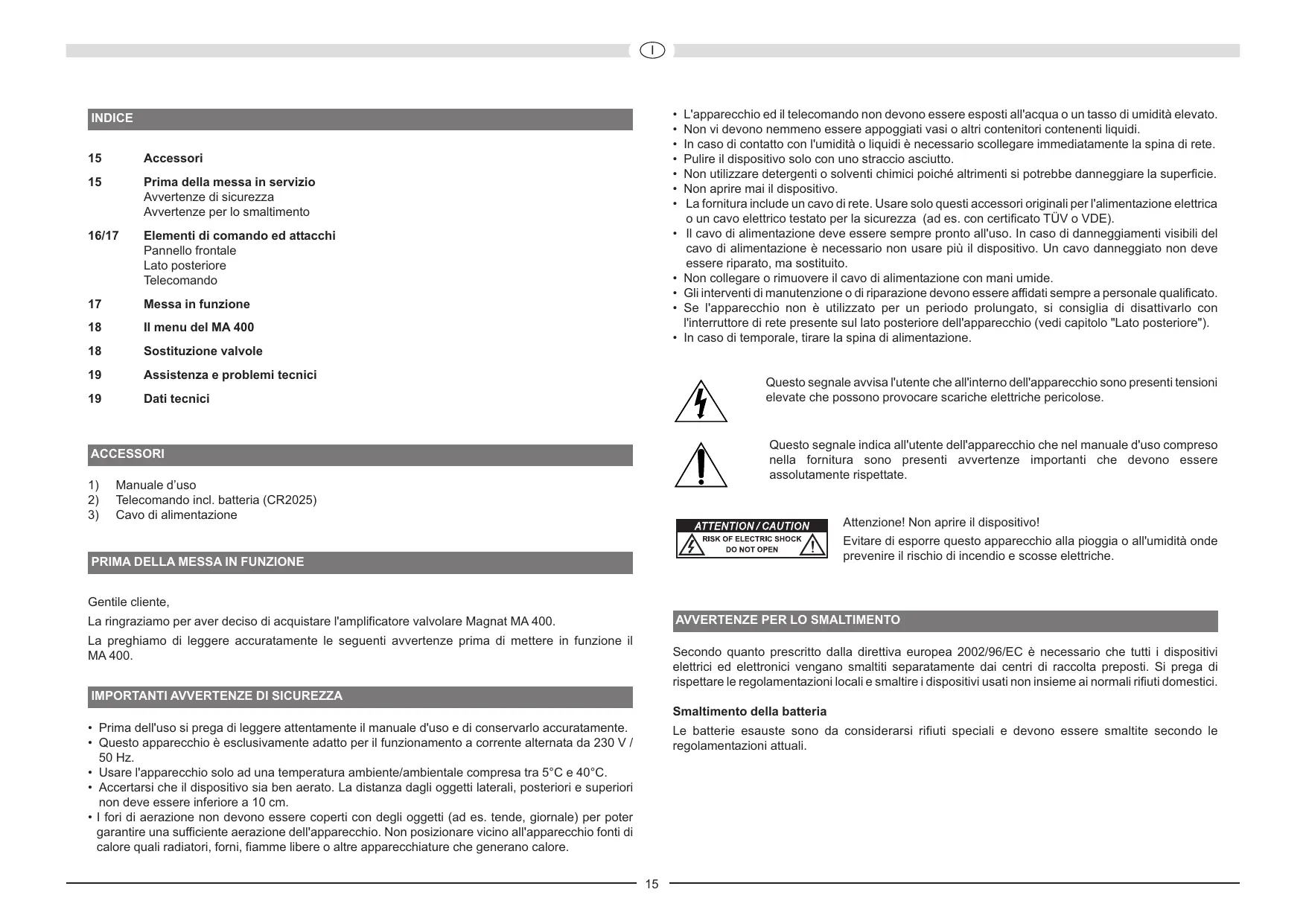 La ringraziamo per aver deciso di acquistare l'amplificatore valvolare Magnat MA 400. La preghiamo di leggere accuratamente le seguenti avvertenze prima di mettere in funzione il MA 400. Secondo quanto prescritto dalla direttiva europea 2002/96/EC è necessario che tutti i dispositivi elettrici ed elettronici vengano smaltiti separatamente dai centri di raccolta preposti. Si prega di rispettare le regolamentazioni locali e smaltire i dispositivi usati non insieme ai normali rifiuti domestici.
