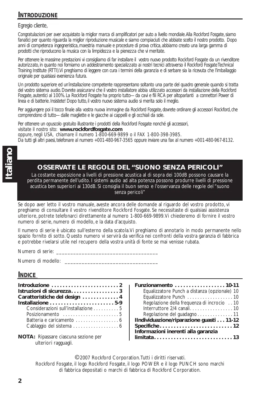 Benvenuti alla Rockford Fosgate! Questo manuale è stato concepito per fornire ragguagli al proprietario, al rivenditore e all'installatore. Per coloro che desiderano informazioni rapide circa l'installazione di questo prodotto, vi preghiamo di consulare la sezione Installazione di questo manuale. Altri ragguagli sono disponibiliattraverso l'indice. Alla Rockford Fosgate, abbreviamo fatto di tutto per assicurarci che tutte le informazioni cont∉ne in questo manuale fosso r corrente. Pertanto, dato che siamo sempre alla ricerca di nuovi modi per migliorare i nostri prodotti, tali informazioni sono soggette a modifiche sulla preavviso.