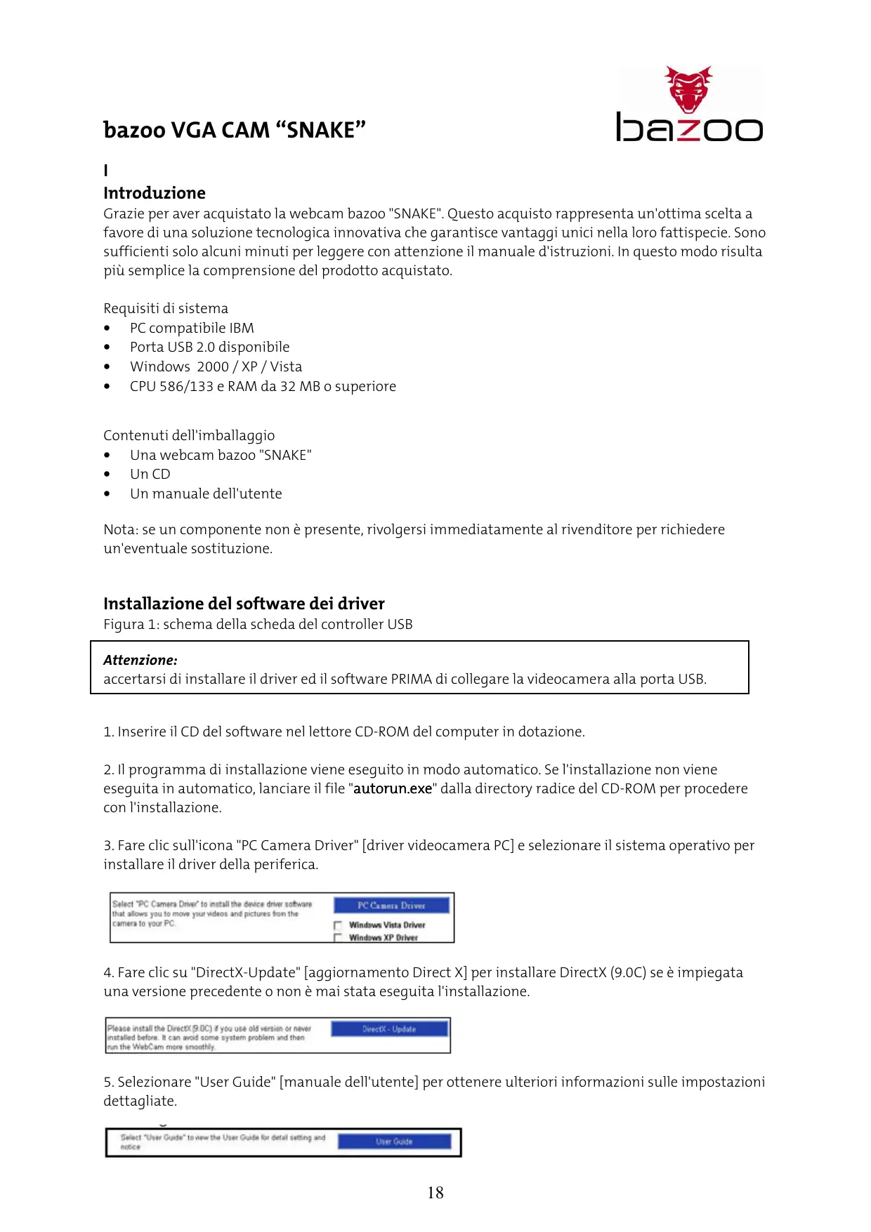 Grazie per aver acquistato la webcam bazoo "SNAKE". Questo acquisto rappresenta un'ottima scelta a favore di una soluzione technologica innovativa che garantisce vantagei unici nella loro fattispecie. Sono sufficienti solo alcuni minuti per leggere con attenzione il manuale d'istruzioni. In quello modo risulta più semplice la comprensione del prodotto acquistato.