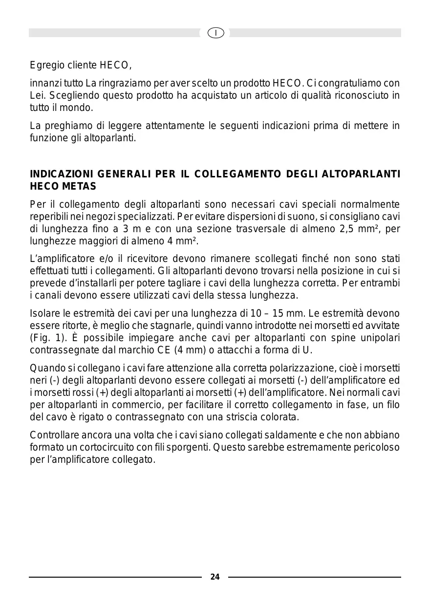 Egregio cliente HECO, innanzi tutto La ringraziamo per aver scelto un prodotto HECO. Cicongratuliamo con Lei. Scegliendo questo prodotto ha acquistato un articolo di qualità riconosciuto in tutto il mondo. La preghiamo di leggere attentamente le seguenti indicazioni prima di mettere in funzione gli altoparlanti. INDICAZIONI GENERALI PER IL COLLEGAMENTO DEGLI ALTOPARLANTI HECO METAS Per il collegamento degli altoparlanti sono necessari cavi speciali normalmente reperibilineinegozi specializzati. P er evitare dispersioni di suono, si consigliano cavi di lunghezza fino a 3 m e con una sezione trasversale di almeno 2,5 mm?, per lunghezze maggiori di aimeno 4 mm2. L'amplificatore e/o il ricevitore devono rimanere scollegati finché non sono stati effettuati tutti i collegamenti. Gli altoparlanti devono trovarsi nella posizione in cui si prevede d'installarli per potere tagliare i cavi della lunghezza corretta. Per entrambi i canali devono essere utilizzati cavi della stessa lunghezza. Isolare le estremità dei cavi per una lunghezza di 10 - 15 mm. Le estremità devono essere ritorte, à meglio che stagnarle, quindi vanno introdotte nei morsetti ed avvitate (Fig. 1). Ë possibile impiegare anche cavi per altoparlanti con spine unipolari contrassegnate dal marchio CE (4 mm) o attacchi a forma di U. Quando si collegano i cavi fare attenzione alla corretta polarizzazione, cioè i morsetti neri (-) degli altoparlanti devono essere collegati ai morsetti (-) dell'amplificatore ed imorsetti rossi (+) degli altoparlanti ai morsetti (+) dell'amplificatore. Nei normali cavi per altoparlanti in commercio, per facilitare il corretto collegamento in fase, un filo del cavo à rigato o contrassegnato con una striscia colorata. Controllare ancora una volta che i cavi siano collegati saldamente e che non abbiano formato un cortocircuito con filisporgenti. Questo sarebbe estremamente pericoloso per l'amplificatore collegato.