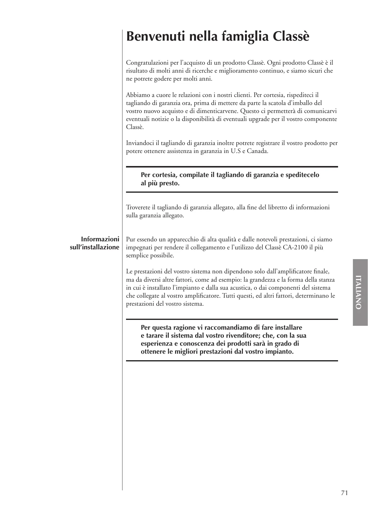 Abbiamo a cuore le relazioni con i nostri clienti. Per cortesia, rispediteci il tagliando di garanzia ora, prima di mettere da parte la scatola d'imballo del,vostro nuovo acquisso e di dimenticarvene. Quito ci permetterà di comunicarvi eventuali notizie o la disponibilità di eventuali upgrade per il vostro componente Classè.