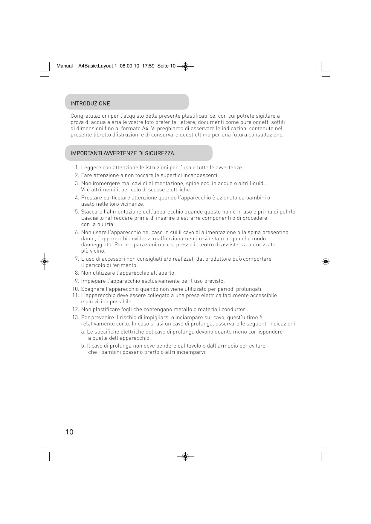 Manual__A4Basic:Layout 1 08.09.10 17:59 Seite 10 INTRODUZIONE Congratulazioni per l’acquisto della presente plastificatrice, con cui potrete sigillare a prova di acqua e aria le vostre foto preferite, lettere, documenti come pure oggetti sottili di dimensioni fino al formato A4. Vi preghiamo di osservare le indicazioni contenute nel presente libretto d’istruzioni e di conservare quest’ultimo per una futura consultazione.