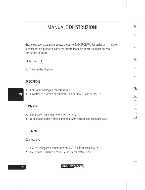 A. Controller analogico con vibrazione B. Il controller è fornito di connettori sia per PS2™ che per PS3™ FUNZIONI A. Può essere usato con PS2™, PS3™ e PC. B. Le modalità Turbo e Slow possono essere attivate con qualsiasi tasto. UTILIZZO Connessioni:
