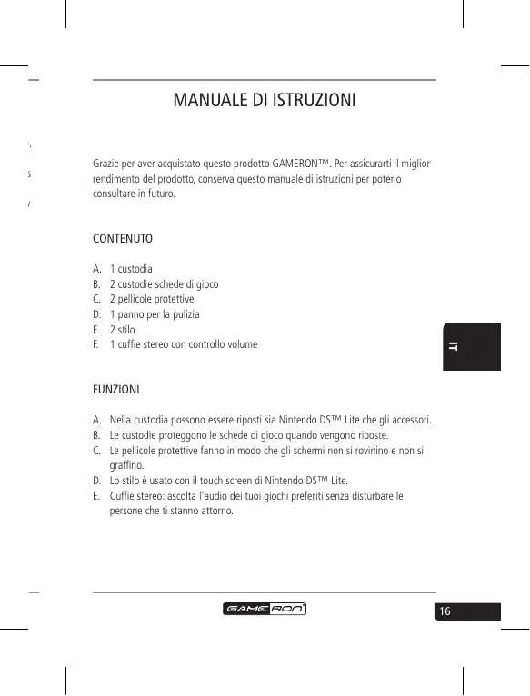 FUNZIONI A. Nella custodia possono essere riposti sia Nintendo DS™ Lite che gli accessori. B. Le custodie proteggono le schede di gioco quando vengono riposte. C. Le pellicole protettive fanno in modo che gli schermi non si rovinino e non si graffino. D. Lo stilo è usato con il touch screen di Nintendo DS™ Lite. E. Cuffie stereo: ascolta l'audio dei tuoi giochi preferiti senza disturbare le persone che ti stanno attorno.