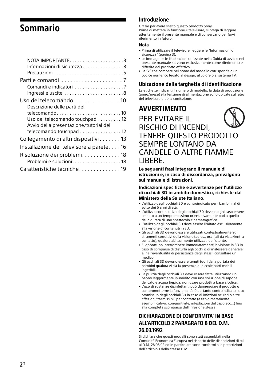 ALL’ARTICOLO 2 PARAGRAFO B DEL D.M. Si dichiara che questi modelli sono stati assemblati nella Comunità Economica Europea nel rispetto delle disposizioni di cui al D.M. 26.03.92 ed in particolare sono conformi alle prescrizioni dell’articolo 1 dello stesso D.M. 2IT NOTA IMPORTANTE Questo prodotto è stato fabbricato da o per conto di Sony Corporation, 1-7-1 Konan Minato-ku Tokyo, 108-0075 Giappone. Eventuali richieste in merito alla conformità del prodotto in ambito della legislazione Europea, dovranno essere indirizzate al rappresentante autorizzato, Sony Deutschland GmbH, Hedelfinger Strasse 61, 70327 Stuttgart, Germania. Per qualsiasi informazione relativa al servizio o la garanzia, si prega di fare riferimento agli indirizzi riportati separatamente sui documenti relativi all’assistenza o sui certificati di garanzia.