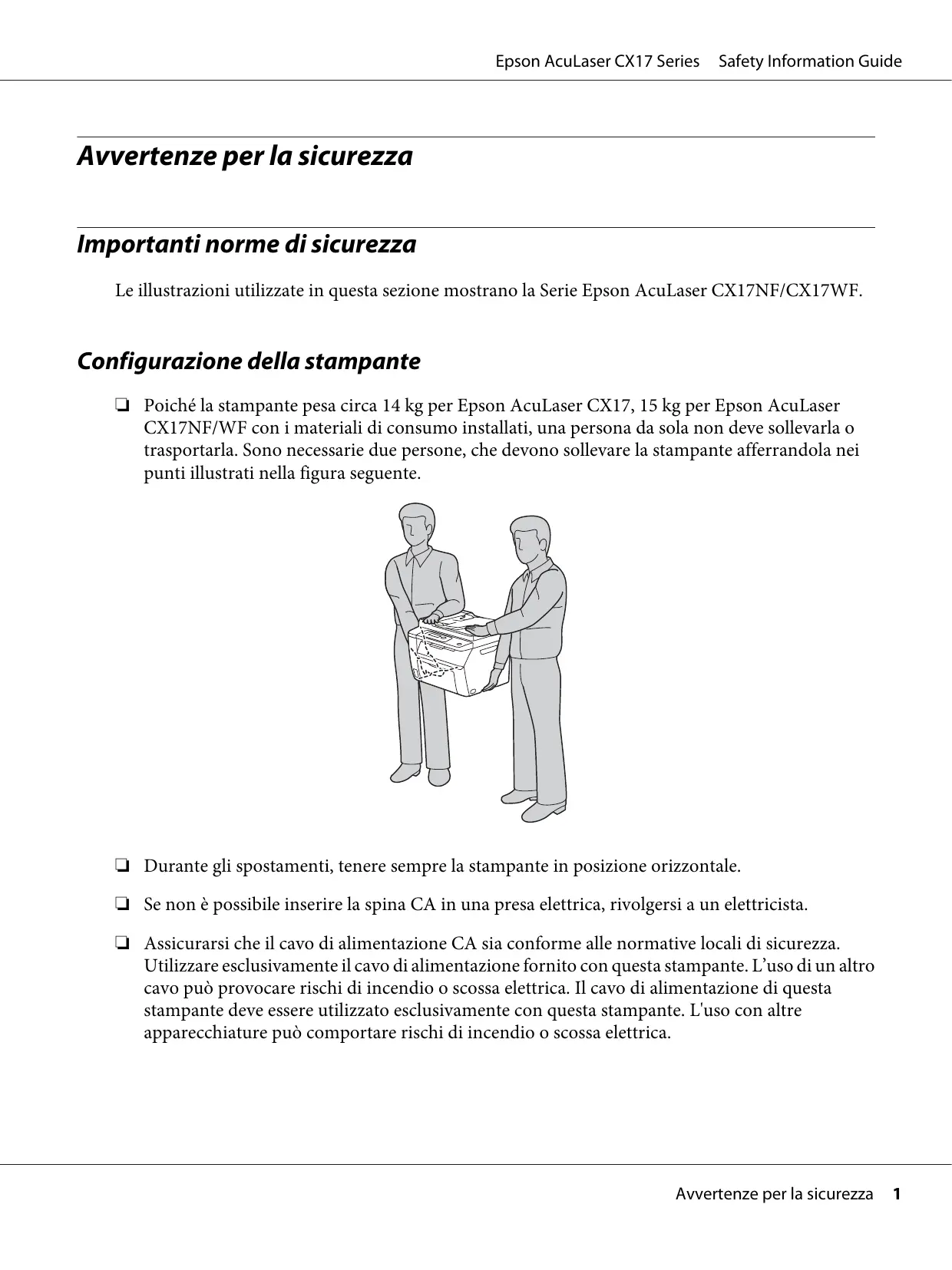 Poiché la stampante pesa circa 14 kg per Epson AcuLaser CX17, 15 kg per Epson AcuLaser CX17NF/WF con i materiali di consumo installati, una persona da sola non deve sollevarla o trasportarla. Sono necessarie due persone, che devono sollevare la stampante afferrandola nei puniti illustrati nella figura seguente.