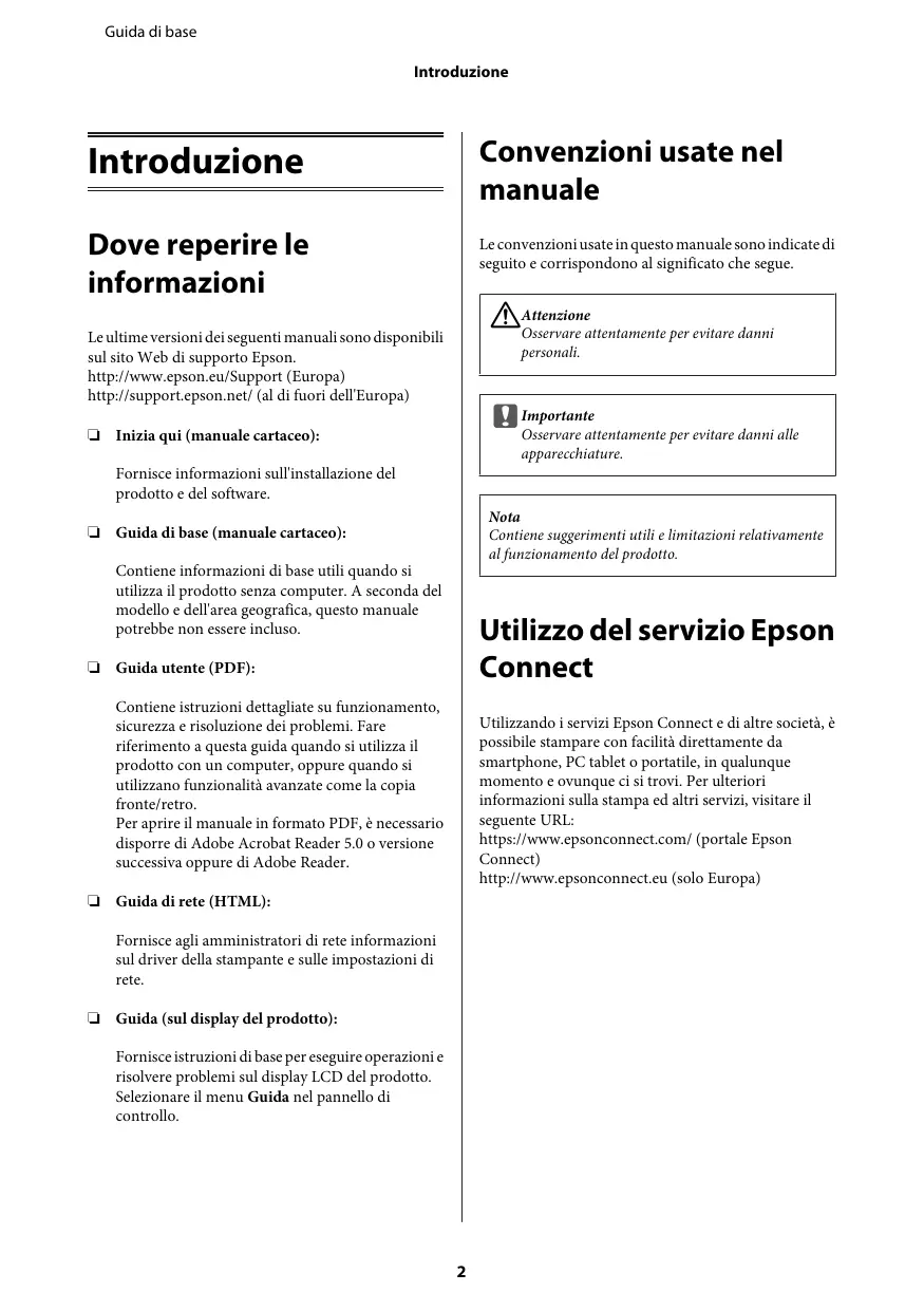 Dove reperire le informazioni. . . . . . . . . . . . . . . . . 2 Convenzioni usate nel manuale. . . . . . . . . . . . . . . . 2 Utilizzo del servizio Epson Connect. . . . . . . . . . . . . 2