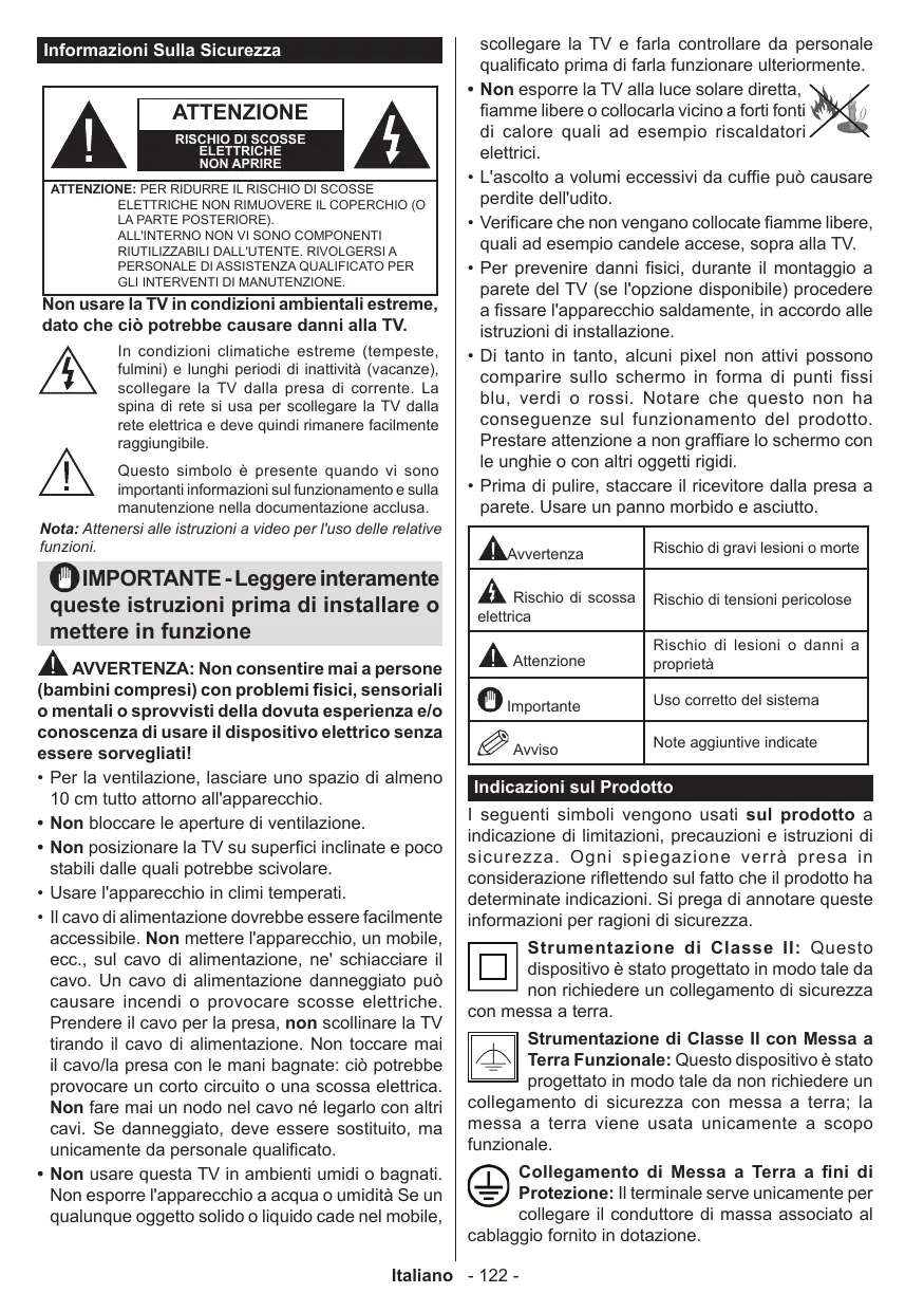 scollegare la TV e farla controllare da personale qualificato prima di farla funzionare ulteriormente. Non esporre la TV alla luce solare diretta, fiamme libere o collocarla vicino a forti fonti di calore quali ad esempio riscaldatori elettrici. L'ascolto a volumi eccessivi da cuffie può causare perdite dell'udito. Verificare che non vengano collocate fiamme libere, quali ad esempio candele accese, sopra alla TV. Per prevenire danni fisici, durante il montaggio a parete del TV (se l'opzione disponibile) procedere a fissare l'apparecchio saldamente, in accordo alle istruzioni di installazione. Di tanto in tanto, alcuni pixel non attivi possono comparire sullo schermo in forma di punti fissi blu, verdi o rossi. Notare che questo non ha conseguenze sul funzionamento del prodotto. Prestare attenzione a non graffiare lo schermo con le unghie o con altri oggetti rigidi. Prima di pulire, staccare il ricevitore dalla presa a parete. Usare un panno morbido e asciutto. Avvertenza Rischio di scossa elettrica Attenzione Importante Avviso