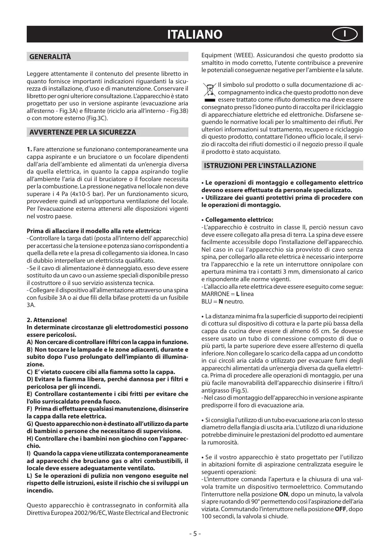 Equipment (WEEE). Assicurandosi che questo prodotto sia smaltito in modo corretto, l’utente contribuisce a prevenire le potenziali conseguenze negative per l’ambiente e la salute. GENERALITÀ Leggere attentamente il contenuto del presente libretto in quanto fornisce importanti indicazioni riguardanti la sicurezza di installazione, d’uso e di manutenzione. Conservare il libretto per ogni ulteriore consultazione. L’apparecchio è stato progettato per uso in versione aspirante (evacuazione aria all’esterno - Fig.3A) e filtrante (riciclo aria all’interno - Fig.3B) o con motore esterno (Fig.3C). Il simbolo sul prodotto o sulla documentazione di accompagnamento indica che questo prodotto non deve essere trattato come rifiuto domestico ma deve essere consegnato presso l’idoneo punto di raccolta per il riciclaggio di apparecchiature elettriche ed elettroniche. Disfarsene seguendo le normative locali per lo smaltimento dei rifiuti. Per ulteriori informazioni sul trattamento, recupero e riciclaggio di questo prodotto, contattare l’idoneo ufficio locale, il servizio di raccolta dei rifiuti domestici o il negozio presso il quale il prodotto è stato acquistato.