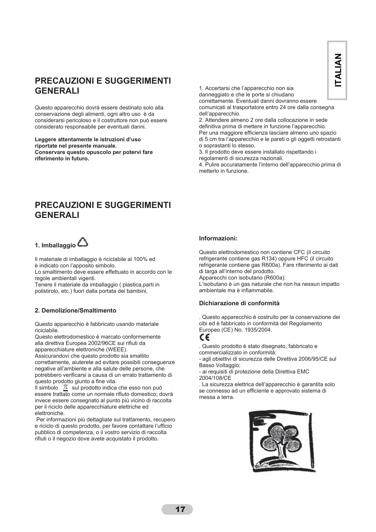 . Questo appearecchio è costruito per la conservazione dei cibi ed è fabbricato in conformità del Regolamento Europeo (CE) No. 1935/2004.
