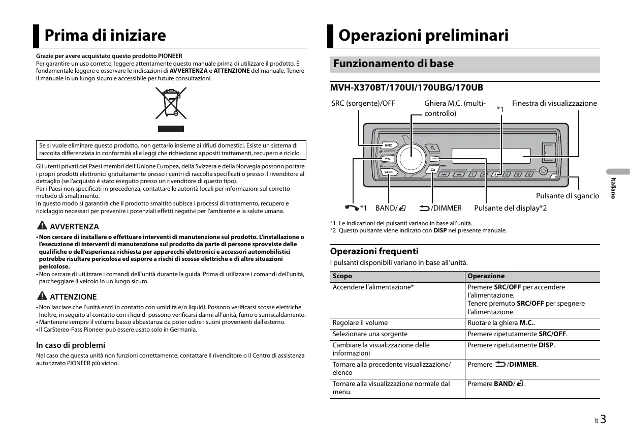 Prima di iniziare Grazie per avere acquistato questo prodotto PIONEER Per garantire un uso corretto, leggere attentamente questo manuale prima di utilizzare il prodotto. È fondamentale leggere e osservare le indicazioni di AVVERTENZA e ATTENZIONE del manuale. Tenere il manuale in un luogo sicuro e accessibile per future consultazioni.