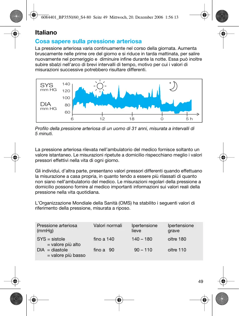 6084401_BP3550/60_S4-80 Seite 49 Mittwoch, 20. Dezember 2006 1:56 13 Italiano Cosa sapere sulla pressione arteriosa La pressione arteriosa varia continuamente nel corso della giornata. Aumenta bruscamente nelle prime ore del giorno e si riduce in tarda mattinata, per salire nuovamente nel pomeriggio e diminuire infine durante la notte. Essa può inoltre subire sbalzi nell’arco di brevi intervalli di tempo, motivo per cui i valori di misurazioni successive potrebbero risultare differenti. SYS