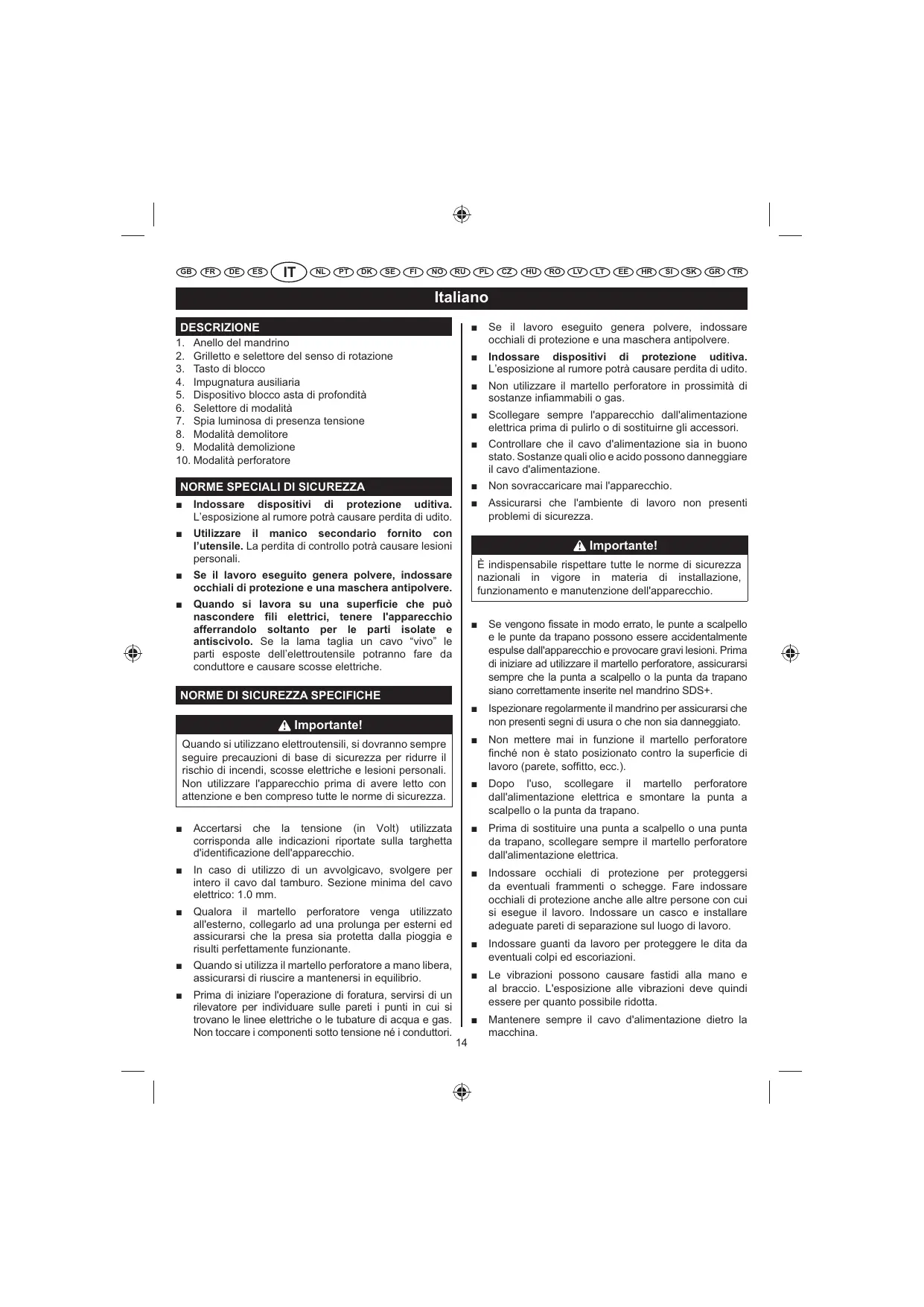 2. Gâchette et sélecteur du sens de rotation 3. Bouton de verrouillage 4. Poignée auxiliaire 5. Butée de Profondeur 6. Sélecteur de mode 7. Témoin de mise sous tension 8. Mode percussion 9. Mode perçage avec burinage 10. Mode perçage Assurez-vous que la tension (en volts) utilisée correspond aux indications figurant sur la plaque signalétique de l'outil.