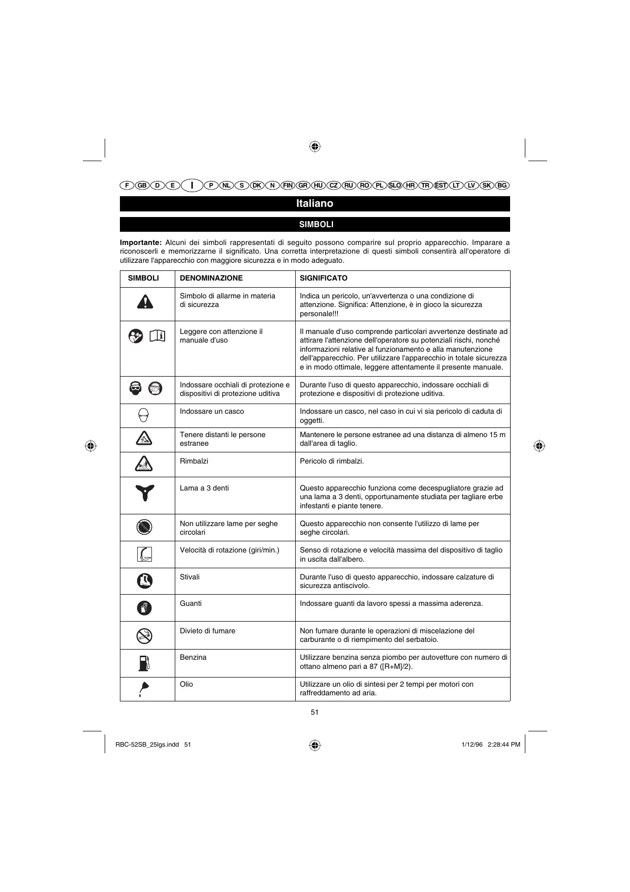 Italiano SIMBOLI Importante: Alcuni dei simboli rappresentati di seguito possono comparire sul proprio apparecchio. Imparare a riconoscerli e memorizzarne il significato. Una corretta interpretazione di questi simboli consentirà all'operatore di utilizzare l'apparecchio con maggiore sicurezza e in modo adeguato. SIMBOLI DENOMINAZIONE SIGNIFICATO Simbolo di allarme in materia di sicurezza Indica un pericolo, un'avvertenza o una condizione di attenzione. Significa: Attenzione, è in gioco la sicurezza personale!!! Leggere con attenzione il manuale d'uso Il manuale d'uso comprende particolari avvertenze destinate ad attirare l'attenzione dell'operatore su potenziali rischi, nonché informazioni relative al funzionamento e alla manutenzione dell'apparecchio. Per utilizzare l'apparecchio in totale sicurezza e in modo ottimale, leggere attentamente il presente manuale. Indossare occhiali di protezione e dispositivi di protezione uditiva Durante l'uso di questo apparecchio, indossare occhiali di protezione e dispositivi di protezione uditiva. Indossare un casco Indossare un casco, nel caso in cui vi sia pericolo di caduta di oggetti. Tenere distanti le persone estranee Mantenere le persone estranee ad una distanza di almeno 15 m dall'area di taglio. Rimbalzi Pericolo di rimbalzi. Lama a 3 denti Questo apparecchio funziona come decespugliatore grazie ad una lama a 3 denti, opportunamente studiata per tagliare erbe infestanti e piante tenere. Non utilizzare lame per seghe circolari Questo apparecchio non consente l'utilizzo di lame per seghe circolari. Velocità di rotazione (giri/min.) Senso di rotazione e velocità massima del dispositivo di taglio in uscita dall'albero. Stivali Durante l'uso di questo apparecchio, indossare calzature di sicurezza antiscivolo. Guanti Indossare guanti da lavoro spessi a massima aderenza. Divieto di fumare Non fumare durante le operazioni di miscelazione del carburante o di riempimento del serbatoio. Benzina Utilizzare benzina senza piombo per autovetture con numero di ottano almeno pari a 87 ([R+M]/2). Olio Utilizzare un olio di sintesi per 2 tempi per motori con raffreddamento ad aria.