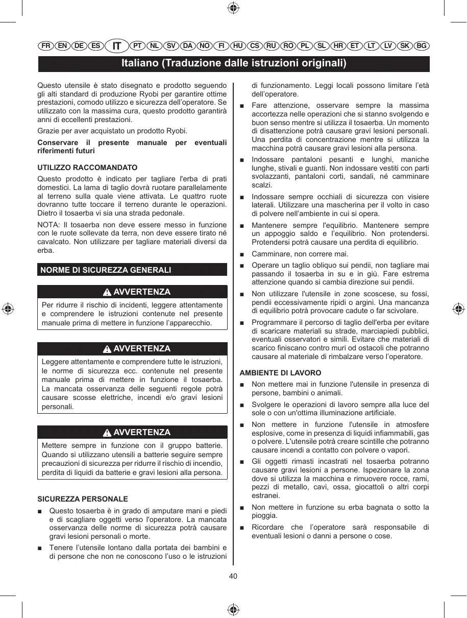 Italiano (Traduzione dalle istruzioni originali) Questo utensile è stato disegnato e prodotto seguendo gli alti standard di produzione Ryobi per garantire ottime prestazioni, comodo utilizzo e sicurezza dell’operatore. Se utilizzato con la massima cura, questo prodotto garantirà anni di eccellenti prestazioni. di funzionamento. Leggi locali possono limitare l’età dell’operatore.