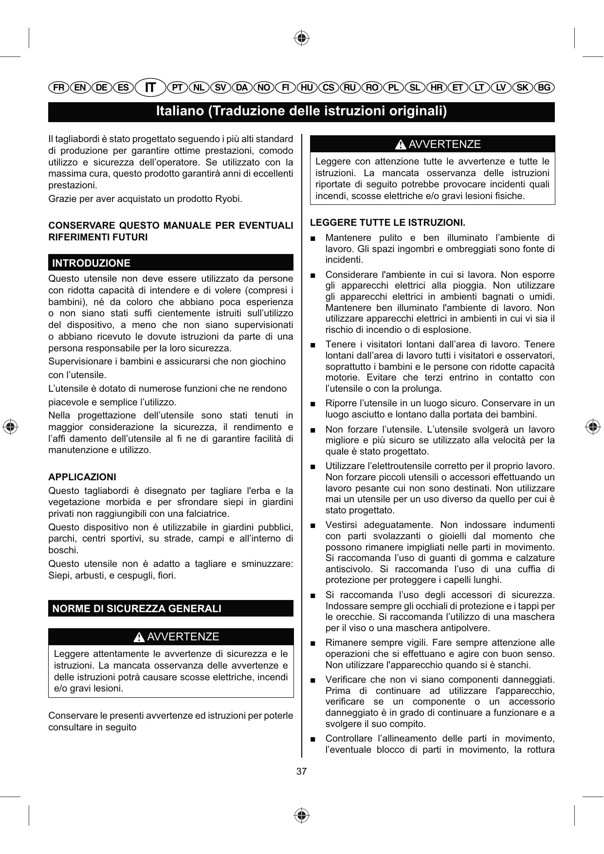 Italiano (Traduzione delle istruzioni originali) Il tagliabordi è stato progettato seguendo i più alti standard di produzione per garantire ottime prestazioni, comodo utilizzo e sicurezza dell’operatore. Se utilizzato con la massima cura, questo prodotto garantirà anni di eccellenti prestazioni. Grazie per aver acquistato un prodotto Ryobi. AVVERTENZE Leggere con attenzione tutte le avvertenze e tutte le istruzioni. La mancata osservanza delle istruzioni riportate di seguito potrebbe provocare incidenti quali ('#"'-(0#%00""*"$$2(#&""1%82)4(*"0(%'(w0(#&" LEGGERE TUTTE LE ISTRUZIONI.