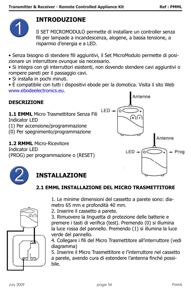 1. Le minime dimensioni del cassetto a parete sono: diametro 65 mm e profondità 40 mm. 2. Inserire il cassetto a parete. 3. Rimuovere la linguetta di protezione delle batterie e premere i tasti di verifica (test). Premendo (0) si illumina la luce rossa del pannello. Premendo (1) si illumina la luce verde del pannello. 4. Collegare i fili del Micro Trasmettitore all'interruttore (vedi diagramma) 5. Inserire il Micro Trasmettitore e l'interruttore nel cassetto a parete, avendo cura di estendere l'antenna finché possibile.2.2 RMML INSTALLAZIONE DEL MICRO RICEVTORE
