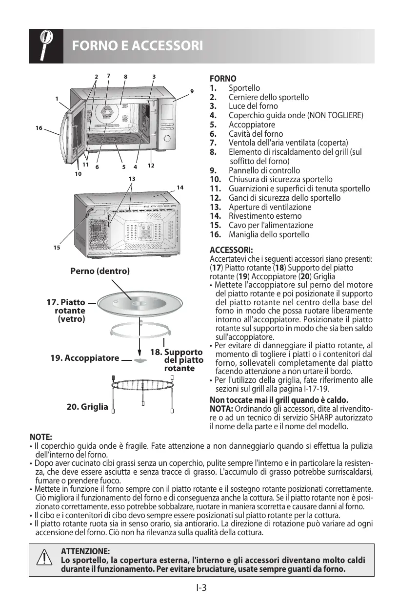 - Per l'utilizzo della griglia, fate riferimento alle sezioni sul grill alla pagina I-17-19. Non toccate mai il grill quando è caldo. NOTA: Ordinando gli accessori, dite al rivenditore o ad un tecnico di servizio SHARP autorizzato il nome della parte e il nome del modello. NOTE: