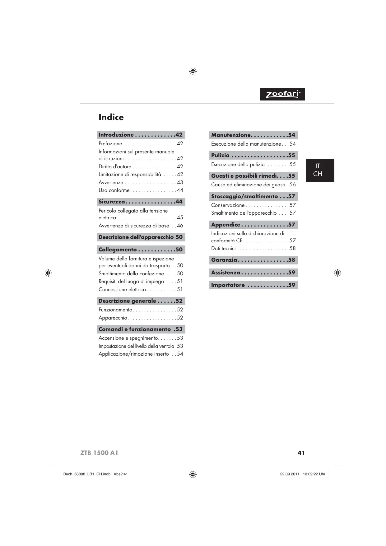 Smaltimento dell'apparecchio Non smaltire per alcun motivo l'apparecchio insieme ai normali rifiuti domestici. Questo prodotto è soggetto alla Direttiva europea 2002/96/EC-RAEE (Rifiuti da apparecchiature elettriche ed elettroniche). Smaltire l'apparecchio presso un'azienda autorizzata o presso l'ente comunale di smaltimento. Rispettare le norme attualmente in vigore. In caso di dubbi mettersi in contatto con l'ente di smaltimento competente. Appendice Indicazioni sulla dichiarazione di conformità CE Questo apparecchio è conforme ai requisiti fondamentali e alle altre norme rilevanti della Direttiva europea per la compatibilità elettromagnetica 2004/108/EC, la Direttiva bassa tensione 2006/95/EC nonché la Direttiva ecodesign 2009/125/EC (Regolamento 1275/2008 Appendice II, n.1) La dichiarazione di conformità originale e completa è a disposizione presso l'importatore. ZTB 1500 A1 Buch_63808_LB1_CH.indb Abs3:57