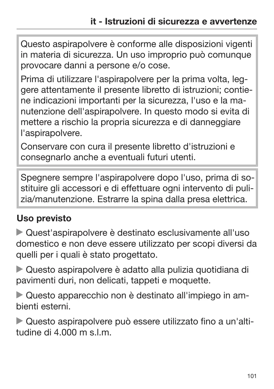 it - Istruzioni di sicurezza e avvertenze Questo aspirapolvere è conforme alle disposizioni vigenti in materia di sicurezza. Un uso improprio può comunque provocare danni a persone e/o cose. Prima di utilizzare l'aspirapolvere per la prima volta, leggere attentamente il presente libretto di istruzioni; contiene indicazioni importanti per la sicurezza, l'uso e la manutenzione dell'aspirapolvere. In questo modo si evita di mettere a rischio la propria sicurezza e di danneggiare l'aspirapolvere. Conservare con cura il presente libretto d'istruzioni e consegnarlo anche a eventuali futuri utenti. Spegnere sempre l'aspirapolvere dopo l'uso, prima di sostituire gli accessori e di effettuare ogni intervento di pulizia/manutenzione. Estrarre la spina dalla presa elettrica. Uso previsto Quest'aspirapolvere è destinato esclusivamente all'uso domestico e non deve essere utilizzato per scopi diversi da quelli per i quali è stato progettato. Questo aspirapolvere è adatto alla pulizia quotidiana di pavimenti duri, non delicati, tappeti e moquette. Questo apparecchio non è destinato all'impiego in ambienti esterni. Questo aspirapolvere può essere utilizzato fino a un'altitudine di 4.000 m s.l.m.
