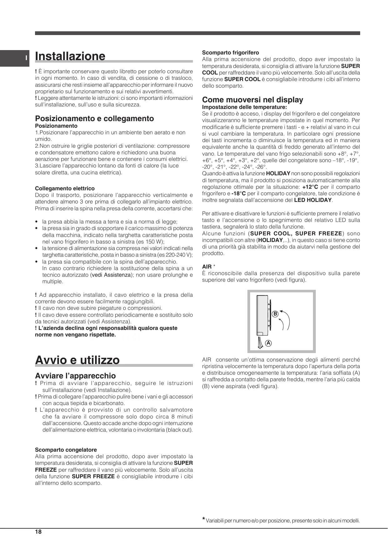 Si l’appareil est en service, les afficheurs du compartiment réfrigérateur et du compartiment congélateur visualiseront les températures sélectionnées à ce moment-là. Pour les modifier, appuyer sur les touches - et + correspondant au compartiment à l’intérieur duquel la température doit être modifiée. Chaque pression sur les touches fait augmenter ou diminuer la température et, de façon équivalente, la quantité de froid généré à l’intérieur du compartiment. Les températures du compartiment réfrigérateur sélectionnables sont: +8°, +7°, +6°, +5°, +4°, +3°, +2°. Celles du congélateur sont : –18°, -19°,-20°, -21°, -22°, -24°, -26°. Quand la fonction HOLIDAY est activée, aucun réglage de température n’est plus possible, l’appareil se place automatiquement au réglage optimal correspondant: +12°C dans le compartiment réfrigérateur et -18°C dans le compartiment congélateur, cette condition est aussi signalée par allumage de la LED HOLIDAY. Pour activer ou désactiver les fonctions, il suffit d’appuyer sur la touche correspondante, la LED correspondante s’allume ou s’éteint sur le tableau de bord pour signaler l’état de la fonction. Certaines fonctions (SUPER COOL, SUPER FREEZE) sont incompatibles avec d’autres (HOLIDAY,..), dans ce cas il y a une priorité déjà établie pour faciliter la gestion de l’appareil. AIR* On le reconnaît à la présence d’un dispositif appliqué à la paroi dans le haut du compartiment réfrigérateur (voir figure).