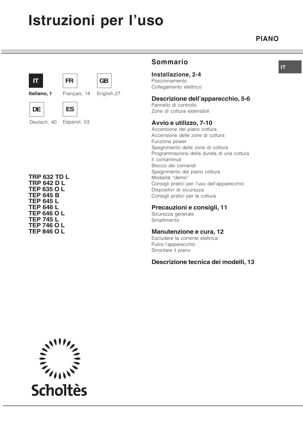 TRP 642 DL - Piano cottura SCHOLTES - Manuale utente e istruzioni gratuiti