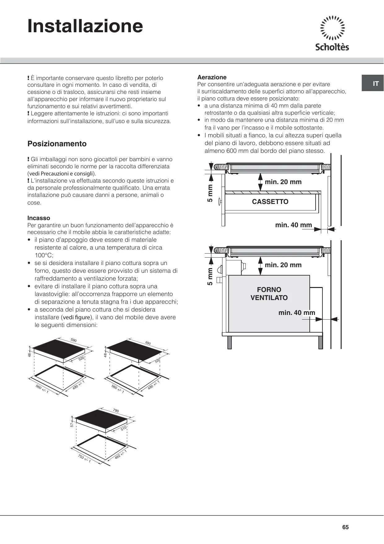 Pour garantir le bon fonctionnement de l’appareil, il faut que le meuble possède des caractéristiques bien précises : • le matériau du plan d’appui doit pouvoir résister à une température d’environ 100°C ; • en cas d’installation de la table de cuisson audessus d’un four, il faut que ce dernier soit équipé d’un dispositif de refroidissement par ventilation forcée ; • éviter d’installer la table de cuisson au-dessus d’un lave-vaisselle : si c’est le cas, prévoir une séparation étanche entre les deux appareils ; • selon la table de cuisson à installer (voir figures), la découpe du meuble doit avoir les dimensions suivantes : 590