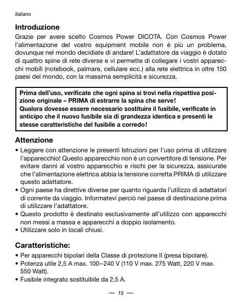 Grazie per avere scelto Cosmos Power DICOTA. Con Cosmos Power l'alimentazione del vosto equipment mobile non è più un problema, dovunque nel mondo decidiate di andare! L'adattatore da viaggio è dotato di quattro spine di rete diverse e vi permette di collegare i vostri appearecchi mobili (notebook, palmare, cellulare ecc.) alla rete elettrica in altri 150 paesi del mondo, con la massima simplicità e sicurezza.