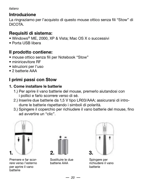 1.) Per apire il vano batterie del mouse, premerlo aiutandosi con i polici e farlo scorrere versusi se.