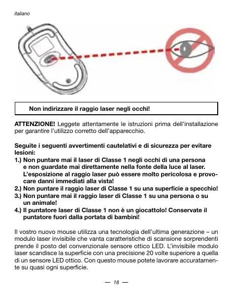 Il vostro nuovo mouse utilizza una technologia dell'ultima generatione – un modulo laser invisibile che vanta caratteristiche di scansione sorpendenti prendi il posto del convenzioneale sensore ottico LED. L'invisibile modulo laser scandisce la superficie con una precisione 20 volte superiore a quella di un sensore LED ottico. Con questo mouse potete lavorare accuratamente su quasi ogni superficie.