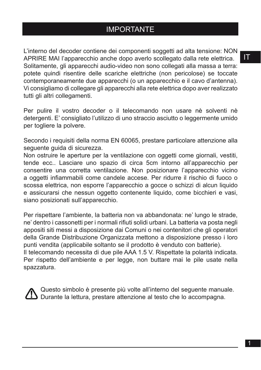 Lorsque vous rencontrez un mot que vous ne comprenez pas, allez voir dans la partie «Glossaire» en fin de notice, la plupart des mots techniques sont expliqués brièvement. Pour nettoyer votre terminal ou sa télécommande, n’employez ni solvant ni détergent. Un chiffon sec ou très légèrement humide sera parfait pour enlever la poussière. Conformément aux obligations faites par le respect de la norme EN 60065, nous attirons votre attention sur les éléments de sécurité suivants. Il convient de ne pas obstruer les ouvertures d’aération avec des objets tels que journaux, nappes, rideaux, etc. Une distance minimale de 5 cm est requise autour de l’appareil pour assurer une aération suffisante. Il convient de ne pas placer sur l’appareil, ou à proximité, des sources de flammes nues telles que des bougies allumées. L’appareil ne doit pas être exposé à des égouttements d’eau ou des éclaboussures et de plus, aucun objet rempli de liquide tel que des vases ne doit être placé sur l’appareil. Lorsque la prise d’alimentation est utilisée comme dispositif de déconnexion, ce dispositif doit demeurer aisément accessible. Par respect de l’environnement et de la réglementation, les piles usagées ne doivent pas être jetées avec les ordures ménagères. Elles doivent être collectées, par exemple, dans votre point de vente où un container spécifique est mis à votre disposition. La télécommande nécessite deux piles AAA 1.5V. Respectez la polarité indiquée dans le logement. Ce symbole est utilisé à plusieurs reprises dans cette notice. Prêtez toute l’attention nécessaire au texte important qu’il repère.