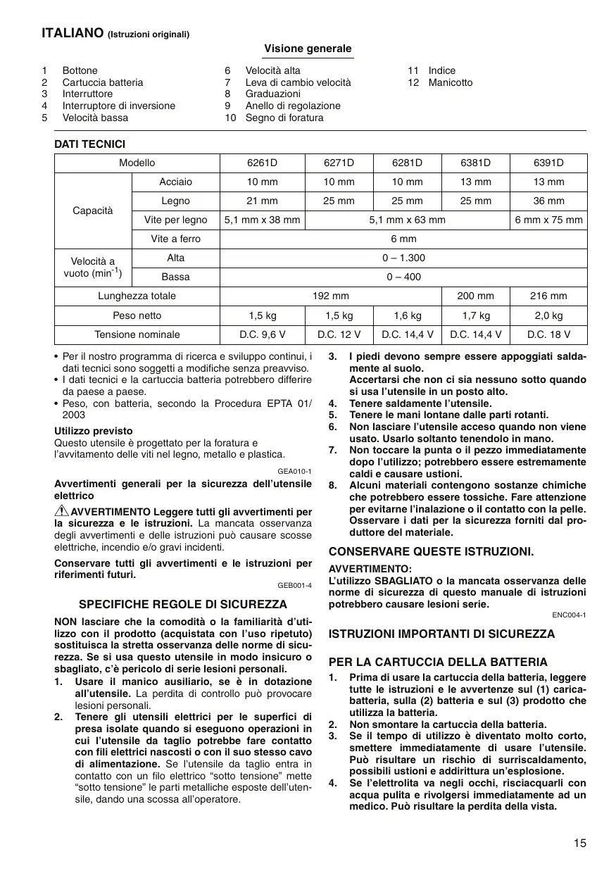 Avvertimenti generali per la sicurezza dell’utensile elettrico AVVERTIMENTO Leggere tutti gli avvertimenti per la sicurezza e le istruzioni. La mancata osservanza degli avvertimenti e delle istruzioni può causare scosse elettriche, incendio e/o gravi incidenti. Conservare tutti gli avvertimenti e le istruzioni per riferimenti futuri. GEB001-4