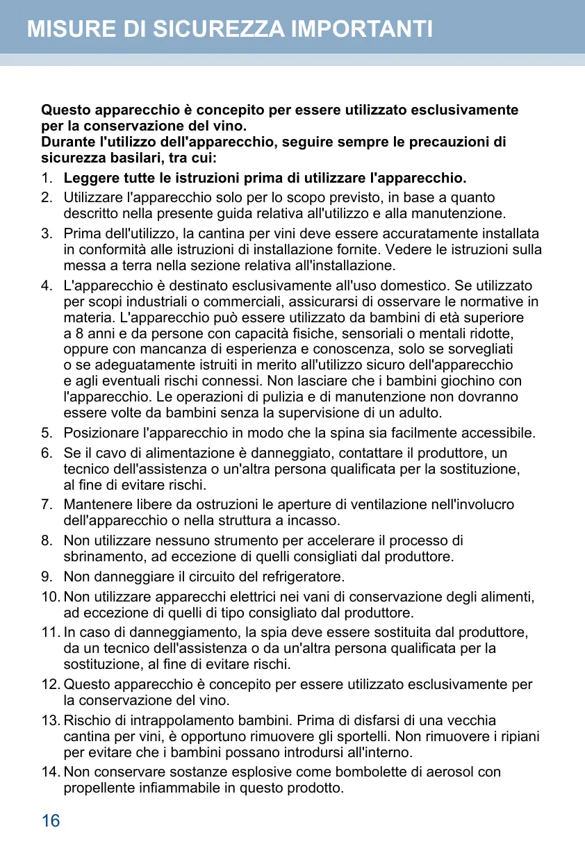 MISURE DI SICUREZZA IMPORTANTI Intestazione 1 Questo apparecchio è concepito per essere utilizzato esclusivamente per la conservazione del vino. Durante l'utilizzo dell'apparecchio, seguire sempre le precauzioni di sicurezza basilari, tra cui: 1. Leggere tutte le istruzioni prima di utilizzare l'apparecchio. 2. Utilizzare l'apparecchio solo per lo scopo previsto, in base a quanto descritto nella presente guida relativa all'utilizzo e alla manutenzione. 3. Prima dell'utilizzo, la cantina per vini deve essere accuratamente installata in conformità alle istruzioni di installazione fornite. Vedere le istruzioni sulla messa a terra nella sezione relativa all'installazione. 4. L'apparecchio è destinato esclusivamente all'uso domestico. Se utilizzato per scopi industriali o commerciali, assicurarsi di osservare le normative in materia. L'apparecchio può essere utilizzato da bambini di età superiore a 8 anni e da persone con capacità fisiche, sensoriali o mentali ridotte, oppure con mancanza di esperienza e conoscenza, solo se sorvegliati o se adeguatamente istruiti in merito all'utilizzo sicuro dell'apparecchio e agli eventuali rischi connessi. Non lasciare che i bambini giochino con l'apparecchio. Le operazioni di pulizia e di manutenzione non dovranno essere volte da bambini senza la supervisione di un adulto. 5. Posizionare l'apparecchio in modo che la spina sia facilmente accessibile. 6. Se il cavo di alimentazione è danneggiato, contattare il produttore, un tecnico dell'assistenza o un'altra persona qualificata per la sostituzione, al fine di evitare rischi. 7. Mantenere libere da ostruzioni le aperture di ventilazione nell'involucro dell'apparecchio o nella struttura a incasso. 8. Non utilizzare nessuno strumento per accelerare il processo di sbrinamento, ad eccezione di quelli consigliati dal produttore. 9. Non danneggiare il circuito del refrigeratore. 10. Non utilizzare apparecchi elettrici nei vani di conservazione degli alimenti, ad eccezione di quelli di tipo consigliato dal produttore. 11. In caso di danneggiamento, la spia deve essere sostituita dal produttore, da un tecnico dell'assistenza o da un'altra persona qualificata per la sostituzione, al fine di evitare rischi. 12. Questo apparecchio è concepito per essere utilizzato esclusivamente per la conservazione del vino. 13. Rischio di intrappolamento bambini. Prima di disfarsi di una vecchia cantina per vini, è opportuno rimuovere gli sportelli. Non rimuovere i ripiani per evitare che i bambini possano introdursi all'interno. 14. Non conservare sostanze esplosive come bombolette di aerosol con propellente infiammabile in questo prodotto.