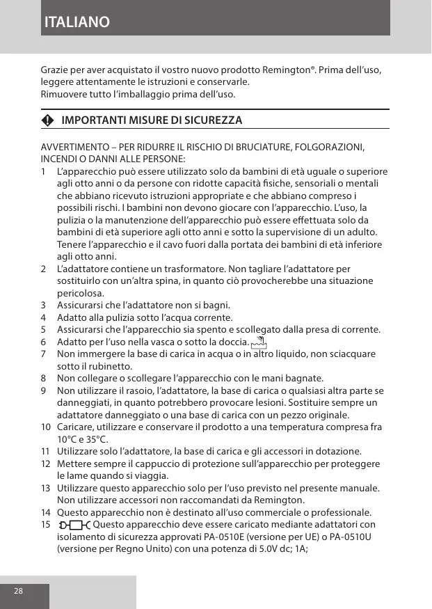 AVVERTIMENTO – PER RIDURRE IL RISCHIO DI BRUCIATURE, FOLGORAZIONI, INCENDI O DANNI ALLE PERSONE: 1 L’apparecchio può essere utilizzato solo da bambini di età uguale o superiore agli otto anni o da persone con ridotte capacità fisiche, sensoriali o mentali che abbiano ricevuto istruzioni appropriate e che abbiano compreso i possibili rischi. I bambini non devono giocare con l’apparecchio. L’uso, la pulizia o la manutenzione dell’apparecchio può essere effettuata solo da bambini di età superiore agli otto anni e sotto la supervisione di un adulto. Tenere l’apparecchio e il cavo fuori dalla portata dei bambini di età inferiore agli otto anni. 2 L’adattatore contiene un trasformatore. Non tagliare l’adattatore per sostituirlo con un’altra spina, in quanto ciò provocherebbe una situazione pericolosa. 3 Assicurarsi che l’adattatore non si bagni. 4 Adatto alla pulizia sotto l’acqua corrente. 5 Assicurarsi che l’apparecchio sia spento e scollegato dalla presa di corrente. 6 Adatto per l’uso nella vasca o sotto la doccia. 7 Non immergere la base di carica in acqua o in altro liquido, non sciacquare sotto il rubinetto. 8 Non collegare o scollegare l’apparecchio con le mani bagnate. 9 Non utilizzare il rasoio, l’adattatore, la base di carica o qualsiasi altra parte se danneggiati, in quanto potrebbero provocare lesioni. Sostituire sempre un adattatore danneggiato o una base di carica con un pezzo originale. 10 Caricare, utilizzare e conservare il prodotto a una temperatura compresa fra 10°C e 35°C. 11 Utilizzare solo l’adattatore, la base di carica e gli accessori in dotazione. 12 Mettere sempre il cappuccio di protezione sull’apparecchio per proteggere le lame quando si viaggia. 13 Utilizzare questo apparecchio solo per l’uso previsto nel presente manuale. Non utilizzare accessori non raccomandati da Remington. 14 Questo apparecchio non è destinato all’uso commerciale o professionale. Questo apparecchio deve essere caricato mediante adattatori con isolamento di sicurezza approvati PA-0510E (versione per UE) o PA-0510U (versione per Regno Unito) con una potenza di 5.0V dc; 1A;