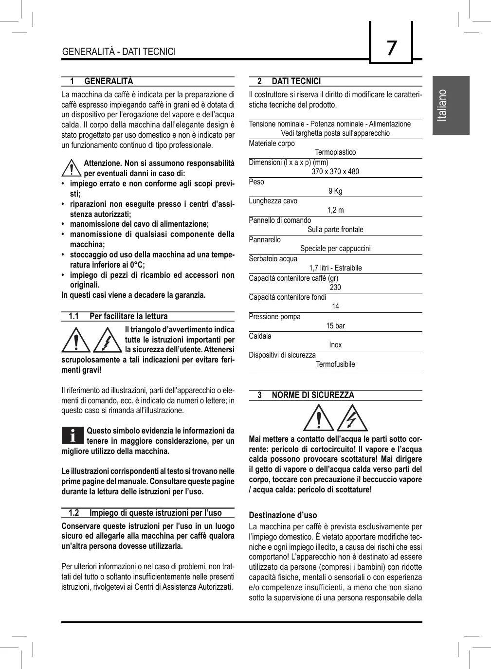 DATI TECNICI Il costruttore si riserva il diritto di modificare le caratteristiche tecniche del prodotto. Tensione nominale - Potenza nominale - Alimentazione Vedi targhetta posta sull’apparecchio Materiale corpo Termoplastico Dimensioni (l x a x p) (mm) 370 x 370 x 480 Peso 9 Kg Lunghezza cavo 1,2 m Pannello di comando Sulla parte frontale Pannarello Speciale per cappuccini Serbatoio acqua 1,7 litri - Estraibile Capacità contenitore caffè (gr) Capacità contenitore fondi Pressione pompa 15 bar Caldaia Inox Dispositivi di sicurezza Termofusibile