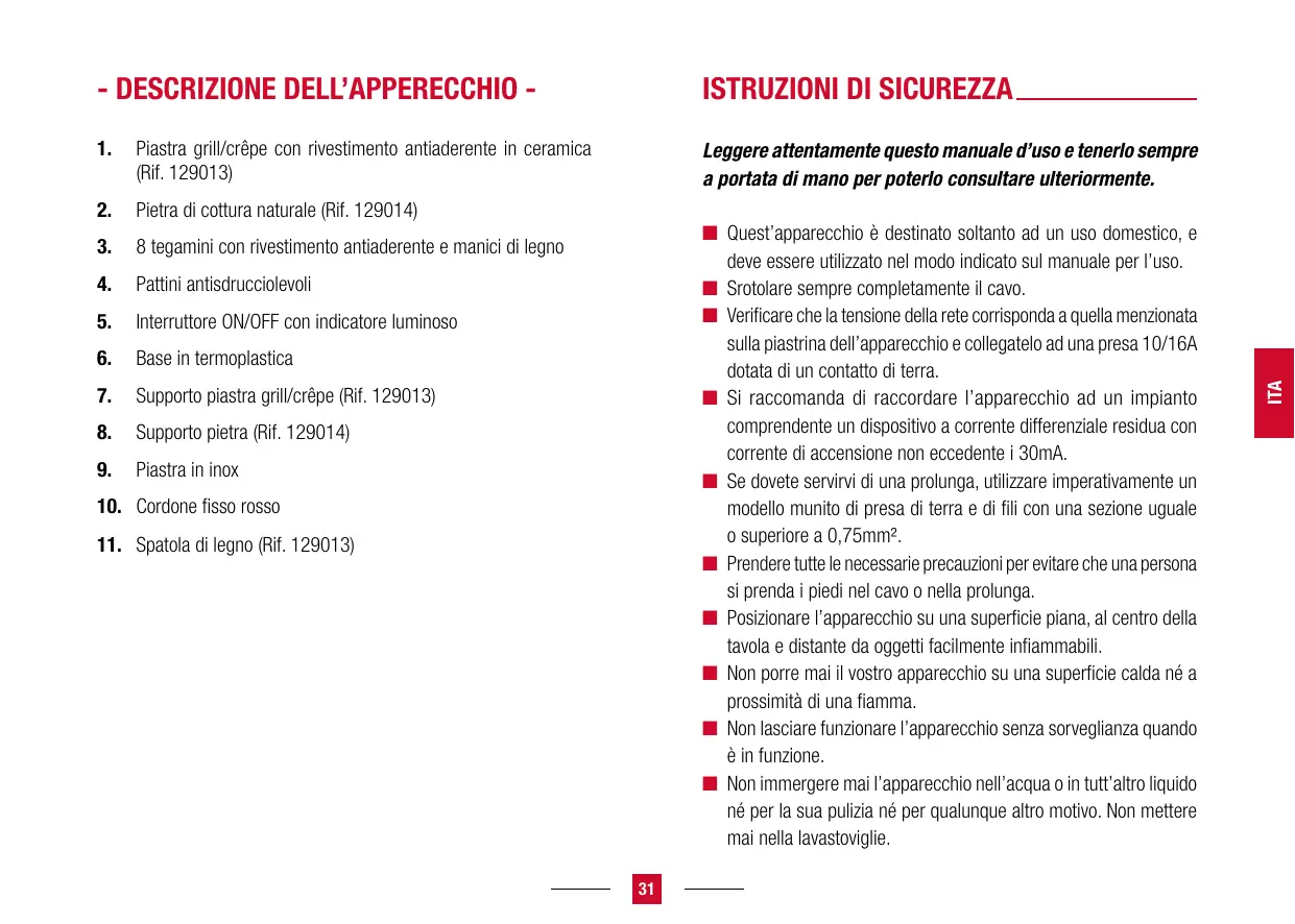 P iastra grill/crêpe con rivestimento antiaderente in ceramica (Rif. 129013) Leggere attentamente questo manuale d’uso e tenerlo sempre a portata di mano per poterlo consultare ulteriormente.