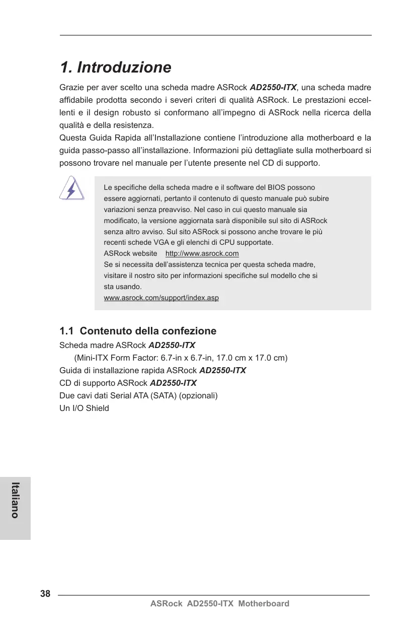 1. Introduzione Grazie per aver scelto una scheda madre ASRock AD2550-ITX, una scheda madre affidabile prodotta secondo i severi criteri di qualità ASRock. Le prestazioni eccellenti e il design robusto si conformano all’impegno di ASRock nella ricerca della qualità e della resistenza. Questa Guida Rapida all’Installazione contiene l’introduzione alla motherboard e la guida passo-passo all’installazione. Informazioni più dettagliate sulla motherboard si possono trovare nel manuale per l’utente presente nel CD di supporto. Le specifiche della scheda madre e il software del BIOS possono essere aggiornati, pertanto il contenuto di questo manuale può subire variazioni senza preavviso. Nel caso in cui questo manuale sia modificato, la versione aggiornata sarà disponibile sul sito di ASRock senza altro avviso. Sul sito ASRock si possono anche trovare le più recenti schede VGA e gli elenchi di CPU supportate. ASRock website http://www.asrock.com Se si necessita dell’assistenza tecnica per questa scheda madre, visitare il nostro sito per informazioni specifiche sul modello che si sta usando. www.asrock.com/support/index.asp