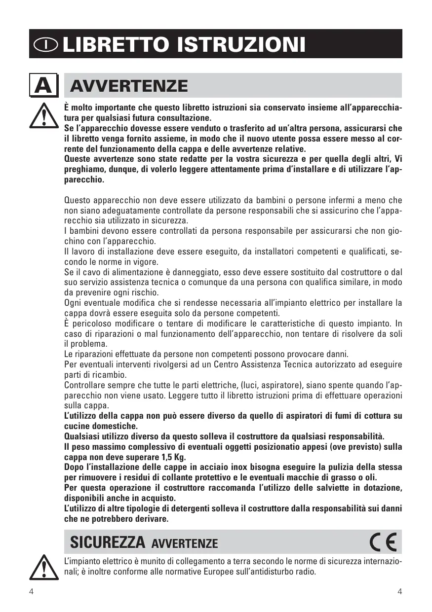 LIBRETTO ISTRUZIONI AVVERTENZE È molto importante che questo libretto istruzioni sia conservato insieme all’apparecchiatura per qualsiasi futura consultazione. Se l’apparecchio dovesse essere venduto o trasferito ad un’altra persona, assicurarsi che il libretto venga fornito assieme, in modo che il nuovo utente possa essere messo al corrente del funzionamento della cappa e delle avvertenze relative. Queste avvertenze sono state redatte per la vostra sicurezza e per quella degli altri, Vi preghiamo, dunque, di volerlo leggere attentamente prima d’installare e di utilizzare l’apparecchio. Questo apparecchio non deve essere utilizzato da bambini o persone infermi a meno che non siano adeguatamente controllate da persone responsabili che si assicurino che l’apparecchio sia utilizzato in sicurezza. I bambini devono essere controllati da persona responsabile per assicurarsi che non giochino con l’apparecchio. Il lavoro di installazione deve essere eseguito, da installatori competenti e qualificati, secondo le norme in vigore. Se il cavo di alimentazione è danneggiato, esso deve essere sostituito dal costruttore o dal suo servizio assistenza tecnica o comunque da una persona con qualifica similare, in modo da prevenire ogni rischio. Ogni eventuale modifica che si rendesse necessaria all’impianto elettrico per installare la cappa dovrà essere eseguita solo da persone competenti. È pericoloso modificare o tentare di modificare le caratteristiche di questo impianto. In caso di riparazioni o mal funzionamento dell’apparecchio, non tentare di risolvere da soli il problema. Le riparazioni effettuate da persone non competenti possono provocare danni. Per eventuali interventi rivolgersi ad un Centro Assistenza Tecnica autorizzato ad eseguire parti di ricambio. Controllare sempre che tutte le parti elettriche, (luci, aspiratore), siano spente quando l’apparecchio non viene usato. Leggere tutto il libretto istruzioni prima di effettuare operazioni sulla cappa. L’utilizzo della cappa non può essere diverso da quello di aspiratori di fumi di cottura su cucine domestiche. Qualsiasi utilizzo diverso da questo solleva il costruttore da qualsiasi responsabilità. Il peso massimo complessivo di eventuali oggetti posizionatio appesi (ove previsto) sulla cappa non deve superare 1,5 Kg. Dopo l’installazione delle cappe in acciaio inox bisogna eseguire la pulizia della stessa per rimuovere i residui di collante protettivo e le eventuali macchie di grasso o oli. Per questa operazione il costruttore raccomanda l’utilizzo delle salviette in dotazione, disponibili anche in acquisto. L’utilizzo di altre tipologie di detergenti solleva il costruttore dalla responsabilità sui danni che ne potrebbero derivare. SICUREZZA AVVERTENZE L’impianto elettrico è munito di collegamento a terra secondo le norme di sicurezza internazionali; è inoltre conforme alle normative Europee sull’antidisturbo radio.